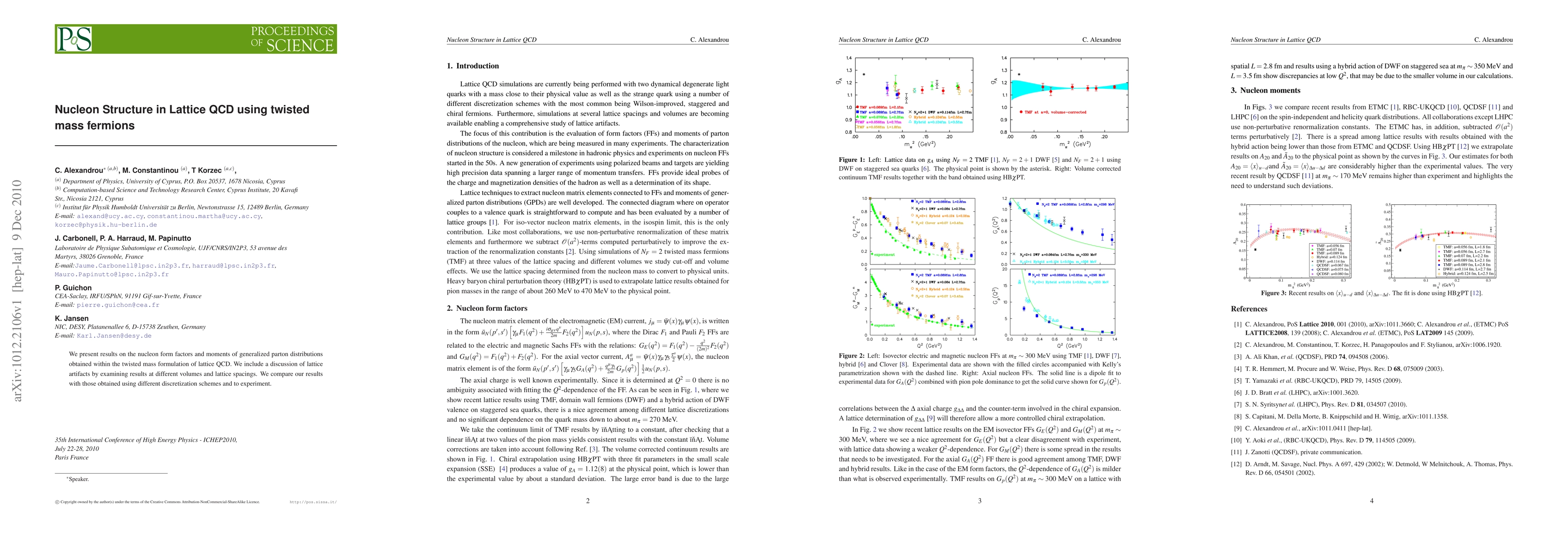 This paper investigates nucleon structure via lattice QCD with twisted mass fermions, focusing on form factors and generalized parton distribution moments. The study addresses lattice artifacts through various volumes and spacings and compares findings with other discretization methods and experimental data.