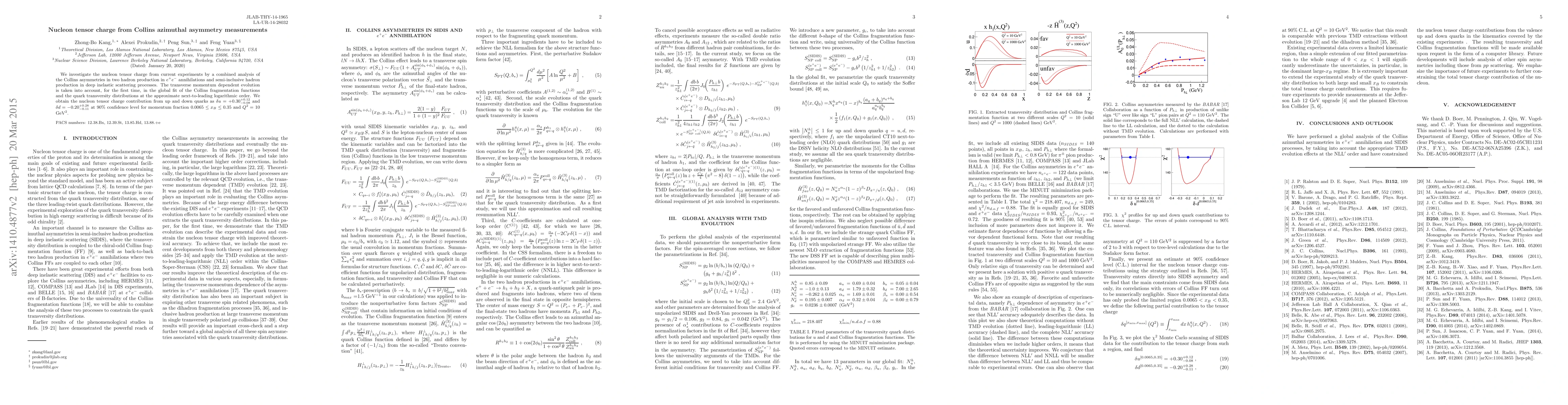 We investigate the nucleon tensor charge from current experiments by a combined analysis of the Collins asymmetries in two hadron production in $e^+e^-$ annihilations and semi-inclusive hadron production in deep inelastic scattering processes. The transverse momentum dependent evolution is taken into account, for the first time, in the global fit of the Collins fragmentation functions and the quark transversity distributions at the approximate next-to-leading logarithmic order. We obtain the nucleon tensor charge contribution from up and down quarks as $\delta u=+0.30^{+0.12}_{-0.08}$ and $\delta d=-0.20_{-0.11}^{+0.28}$ at 90\% confidence level for momentum fraction $0.0065 \le x_B \le 0.35$ and $Q^2=$ 10 GeV$^2$.