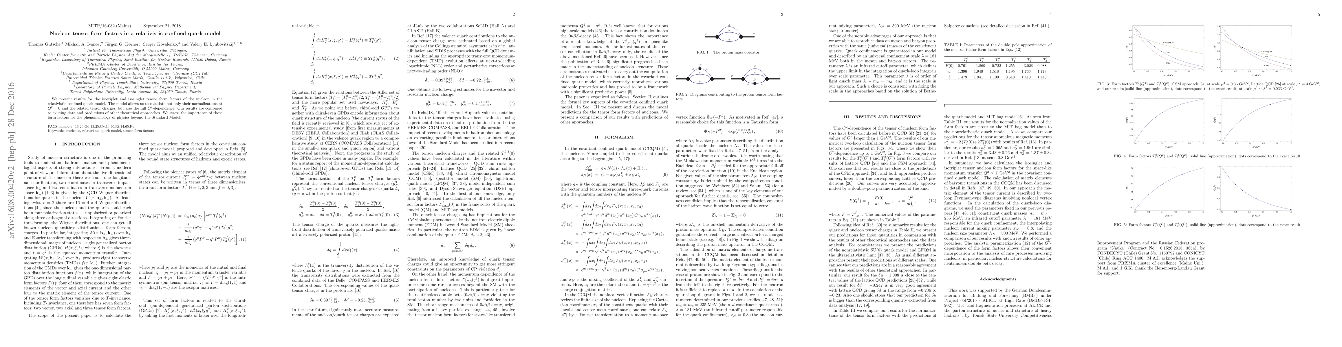 This paper presents calculations of nucleon tensor form factors in a relativistic confined quark model, providing both normalizations and $Q^2$-dependence, and compares these results with existing data and theoretical predictions, highlighting their significance for physics beyond the Standard Model.