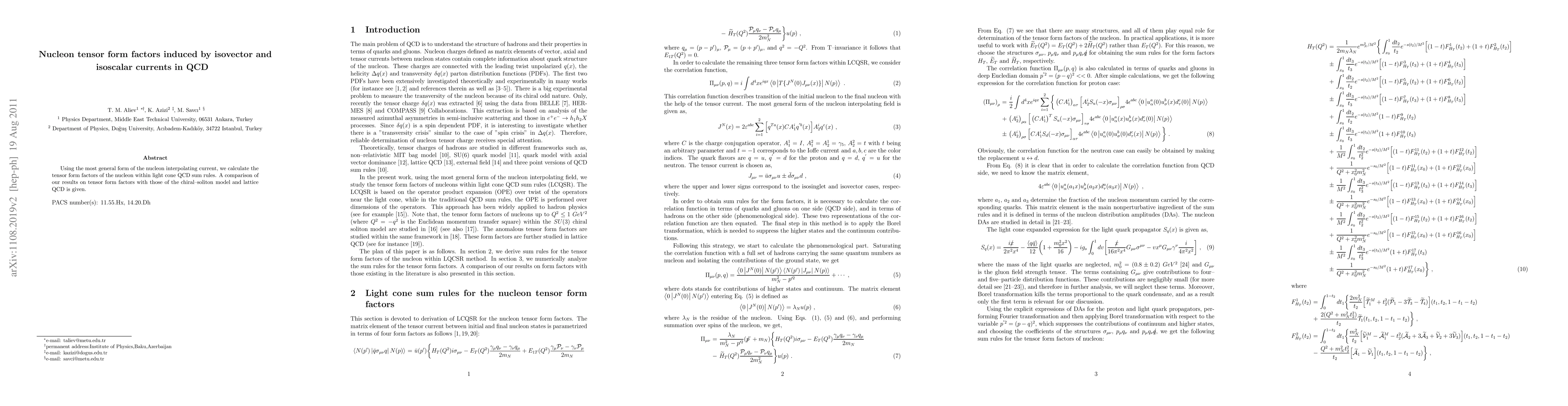 The research calculates nucleon tensor form factors within light cone QCD sum rules using the most general form of the nucleon interpolating current, comparing results with the chiral-soliton model and lattice QCD.