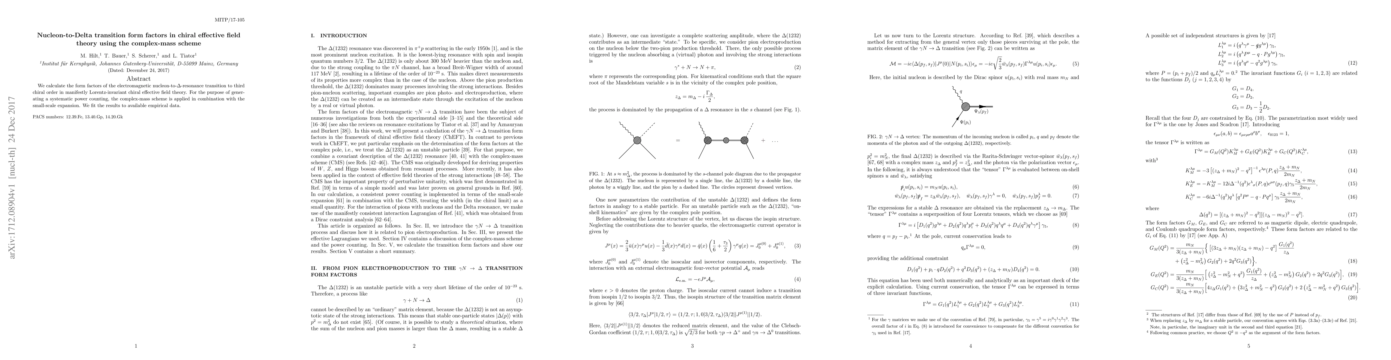 This paper calculates nucleon-to-Delta transition form factors up to third chiral order using Lorentz-invariant chiral effective field theory and the complex-mass scheme, aiming for systematic power counting. The results are fitted to empirical data for validation.