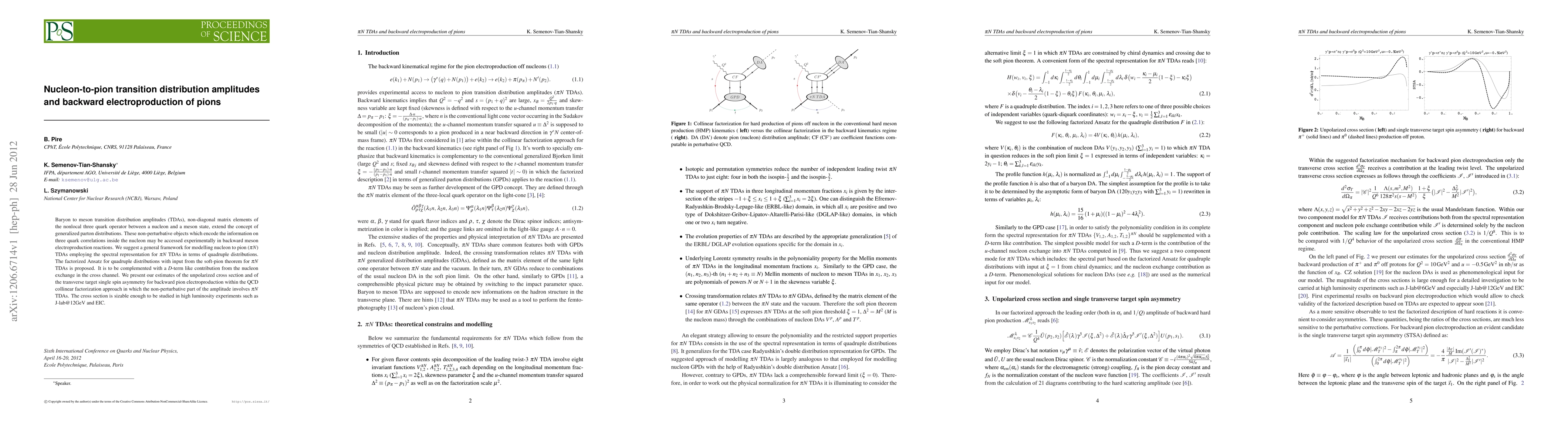 Baryon to meson transition distribution amplitudes (TDAs), non-diagonal matrix elements of the nonlocal three quark operator between a nucleon and a meson state, extend the concept of generalized parton distributions. These non-perturbative objects which encode the information on three quark correlations inside the nucleon may be accessed experimentally in backward meson electroproduction reactions. We suggest a general framework for modelling nucleon to pion (pi N) TDAs employing the spectral representation for pi N TDAs in terms of quadruple distributions. The factorized Ansatz for quadruple distributions with input from the soft-pion theorem for pi N TDAs is proposed. It is to be complemented with a D-term like contribution from the nucleon exchange in the cross channel. We present our estimates of the unpolarized cross section and of the transverse target single spin asymmetry for backward pion electroproduction within the QCD collinear factorization approach in which the non-perturbative part of the amplitude involves pi N TDAs. The cross section is sizable enough to be studied in high luminosity experiments such as J-lab@12GeV and EIC.