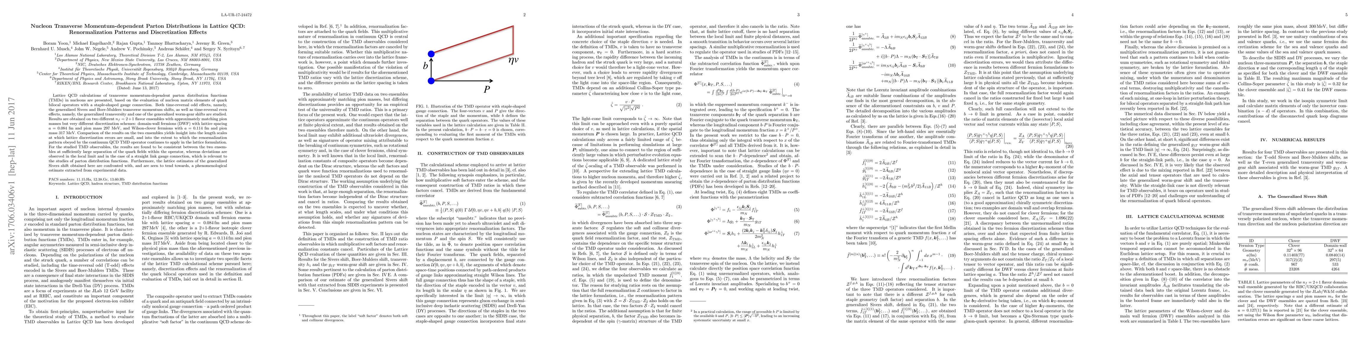 Lattice QCD calculations of transverse momentum-dependent parton distribution functions (TMDs) in nucleons are presented, based on the evaluation of nucleon matrix elements of quark bilocal operators with a staple-shaped gauge connection. Both time-reversal odd effects, namely, the generalized Sivers and Boer-Mulders transverse momentum shifts, as well as time-reversal even effects, namely, the generalized transversity and one of the generalized worm-gear shifts are studied. Results are obtained on two different $n_f = 2+1$ flavor ensembles with approximately matching pion masses but very different discretization schemes: domain-wall fermions (DWF) with lattice spacing $a=0.084$ fm and pion mass 297 MeV, and Wilson-clover fermions with $a=0.114$ fm and pion mass 317 MeV. Comparison of the results on the two ensembles yields insight into the length scales at which lattice discretization errors are small, and into the extent to which the renormalization pattern obeyed by the continuum QCD TMD operator continues to apply in the lattice formulation. For the studied TMD observables, the results are found to be consistent between the two ensembles at sufficiently large separation of the quark fields within the operator, whereas deviations are observed in the local limit and in the case of a straight link gauge connection, which is relevant to the studies of parton distribution functions. Furthermore, the lattice estimates of the generalized Sivers shift obtained here are confronted with, and are seen to tend towards, a phenomenological estimate extracted from experimental data.