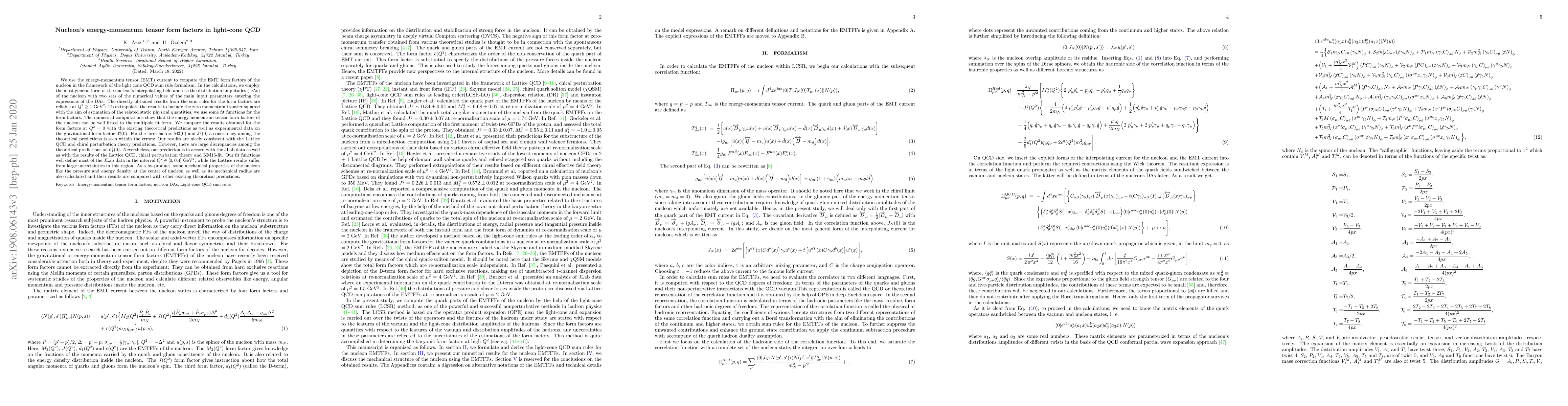 This paper computes nucleon's energy-momentum tensor form factors using light cone QCD sum rules, showing reliable results at $Q^2\geq1~GeV^2$. The study fits the form factors to multipole functions and compares predictions with Lattice QCD, chiral perturbation theory, and experimental data, finding consistency for M$_2^q (0)$ and J$^q(0)$, but discrepancies for d$_1^q(0)$.