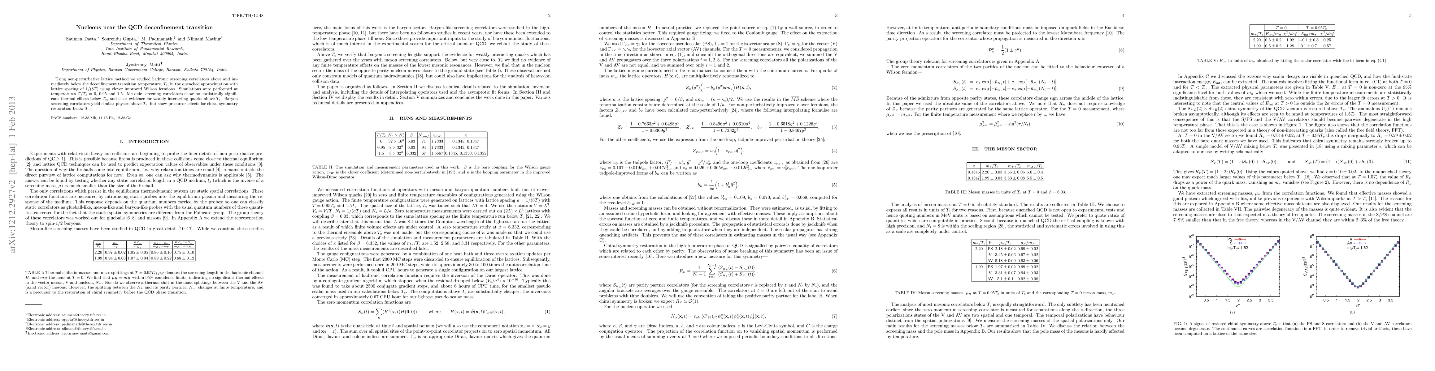 Using non-perturbative lattice method we studied hadronic screening correlators above and immediately below the deconfinement transition temperature, Tc, in the quenched approximation with lattice spacing of 1/(8T) using clover improved Wilson fermions. Simulations were performed at temperatures T /Tc = 0, 0.95 and 1.5. Mesonic screening correlators show no statistically significant thermal effects below Tc, and clear evidence for weakly interacting quarks above Tc . Baryon screening correlators yield similar physics above Tc, but show precursor effects for chiral symmetry restoration below Tc .