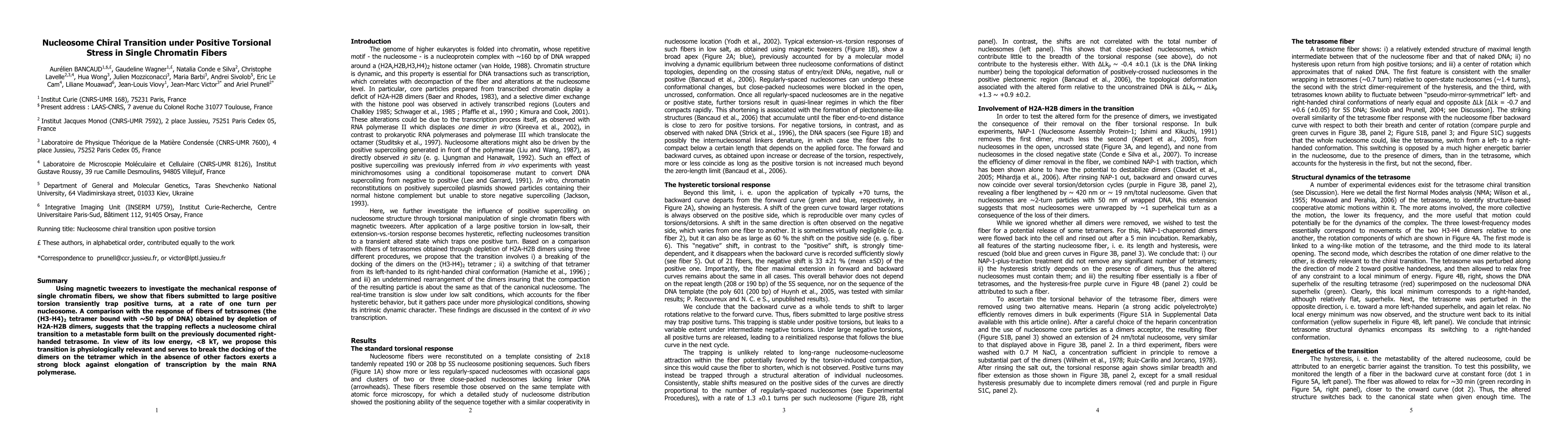 This study reveals that single chromatin fibers under positive torsional stress exhibit a chiral transition in nucleosomes, trapping one positive turn per nucleosome. This transition, occurring in a low-energy state, suggests a physiological role in breaking the docking of dimers on the tetramer, potentially facilitating transcription elongation.