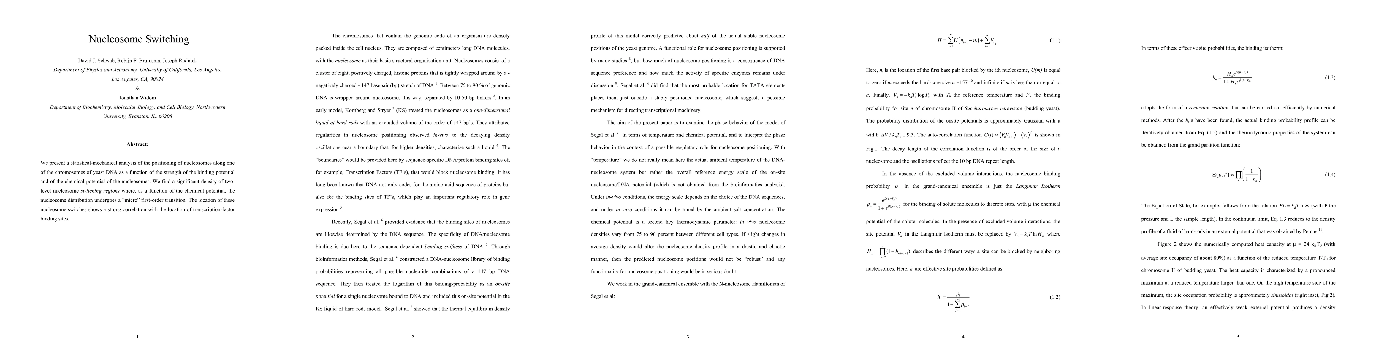 We present a statistical-mechanical analysis of the positioning of nucleosomes along one of the chromosomes of yeast DNA as a function of the strength of the binding potential and of the chemical potential of the nucleosomes. We find a significant density of two-level nucleosome switching regions where, as a function of the chemical potential, the nucleosome distribution undergoes a "micro" first-order transition. The location of these nucleosome switches shows a strong correlation with the location of transcription-factor binding sites.