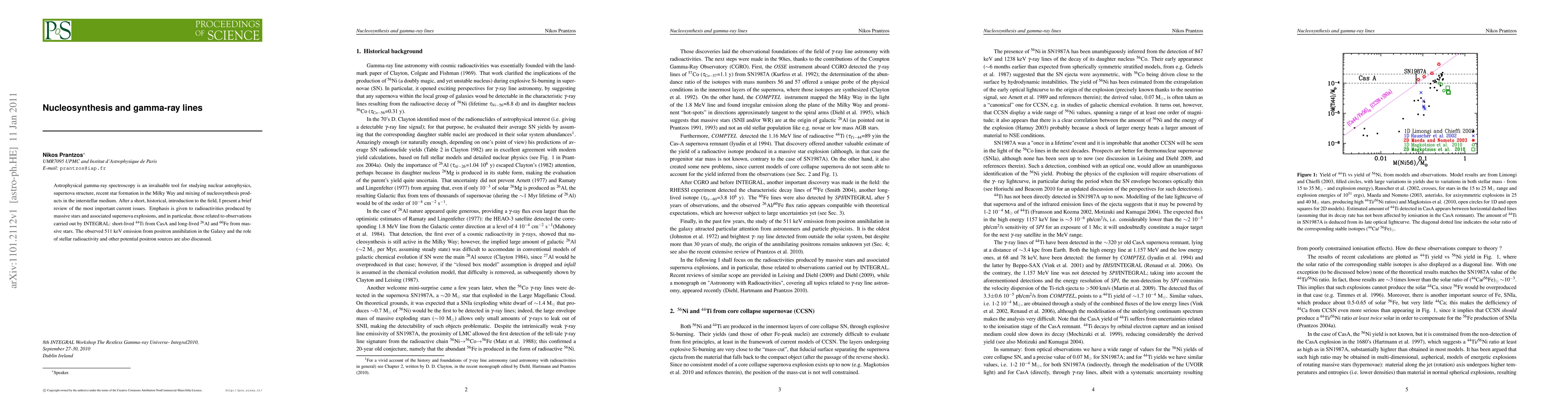 The paper presents a review of current issues in nucleosynthesis and gamma-ray lines, focusing on radioactivities produced by massive stars and supernova explosions, particularly Ti-44 from Cassiopeia A, Al-26, and Fe-60. It also discusses the 511 keV emission from positron annihilation in the Galaxy and its potential sources.