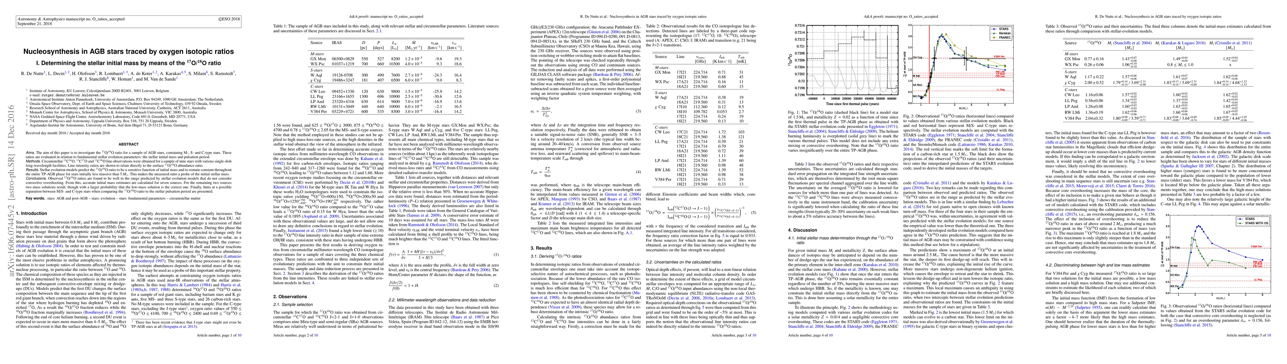 This paper investigates the $^{17}$O/$^{18}$O ratio in AGB stars to determine their initial mass, finding a direct correlation between the ratio and initial mass, which allows for accurate mass estimates for most stars. It also suggests a potential distinction between M/S- and C-type stars based on these ratios.