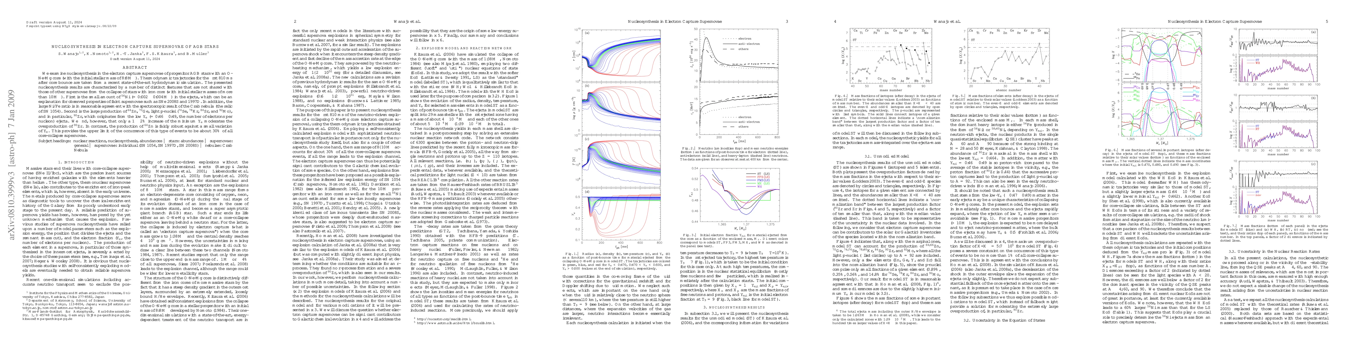 This paper investigates nucleosynthesis in electron capture supernovae of 8.8 M_\odot AGB stars, revealing distinct features such as low 56Ni production and high Ni/Fe ratios, which align with faint supernovae observations. The study also highlights significant production of 64Zn, 70Ge, and light p-nuclei, particularly 90Zr, due to low ejecta electron fractions.