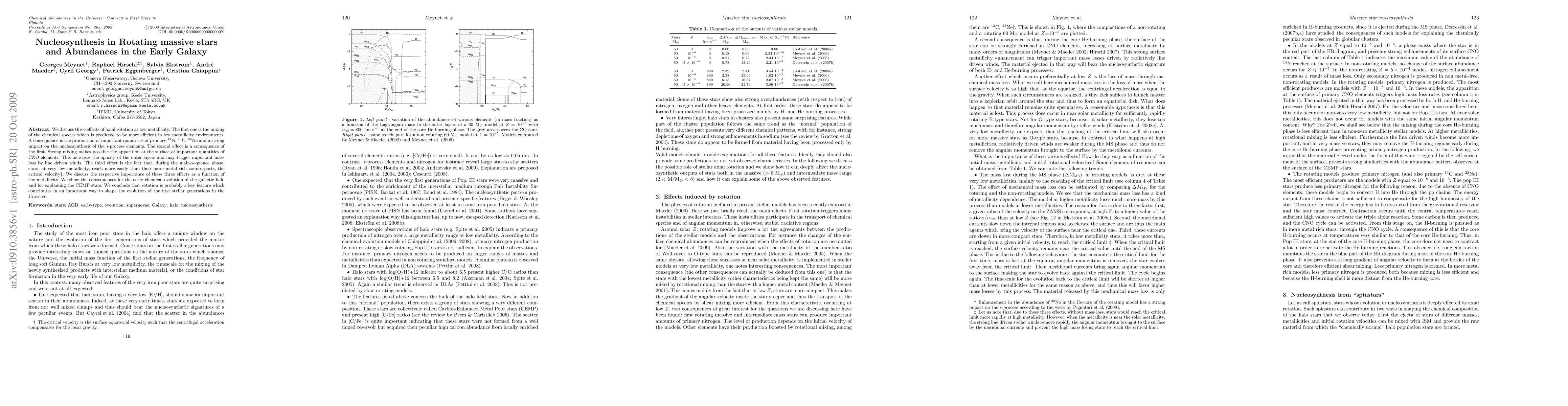 We discuss three effects of axial rotation at low metallicity. The first one is the mixing of the chemical species which is predicted to be more efficient in low metallicity environments. A consequence is the production of important quantities of primary $^{14}$N, $^{13}$C, $^{22}$Ne and a strong impact on the nucleosynthesis of the {\it s}-process elements. The second effect is a consequence of the first. Strong mixing makes possible the apparition at the surface of important quantities of CNO elements. This increases the opacity of the outer layers and may trigger important mass loss by line driven winds. The third effect is the fact that, during the main-sequence phase, stars, at very low metallicity, reach more easily than their more metal rich counterparts, the critical velocity\footnote{The critical velocity is the surface equatorial velocity such that the centrifugal acceleration compensates for the local gravity.}. We discuss the respective importance of these three effects as a function of the metallicity. We show the consequences for the early chemical evolution of the galactic halo and for explaining the CEMP stars. We conclude that rotation is probably a key feature which contributes in an important way to shape the evolution of the first stellar generations in the Universe.