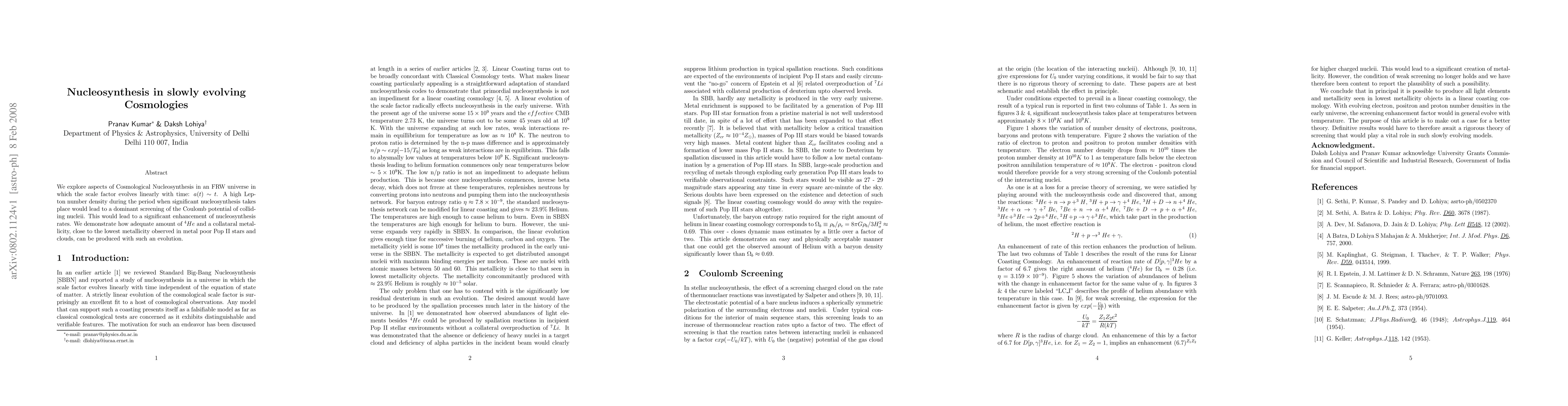 We explore aspects of Cosmological Nucleosynthesis in an FRW universe in which the scale factor evolves linearly with time: $a(t) \sim t$. A high Lepton number density during the period when significant nucleosynthesis takes place would lead to a dominant screening of the Coulomb potential of colliding nucleii. This would lead to a significant enhancement of nucleosynthesis rates. We demonstrate how adequate amount of $^4He$ and a collataral metallicity, close to the lowest metallicity observed in metal poor Pop II stars and clouds, can be produced with such an evolution.