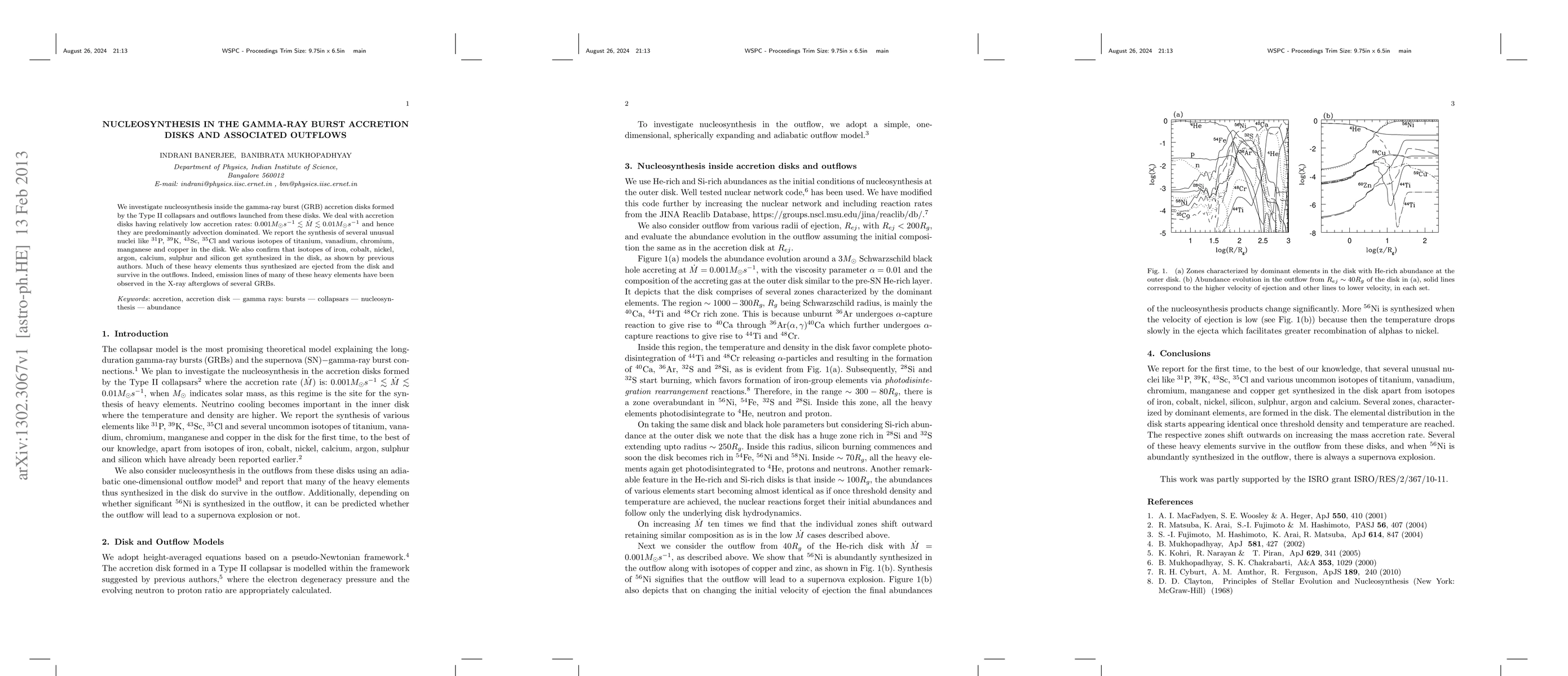 This paper explores nucleosynthesis in gamma-ray burst accretion disks formed by Type II collapsars, focusing on low accretion rates and the synthesis of unusual nuclei like 31P and 39K. It confirms the production of heavy elements such as iron and nickel, which are ejected in outflows and observed in GRB X-ray afterglows.