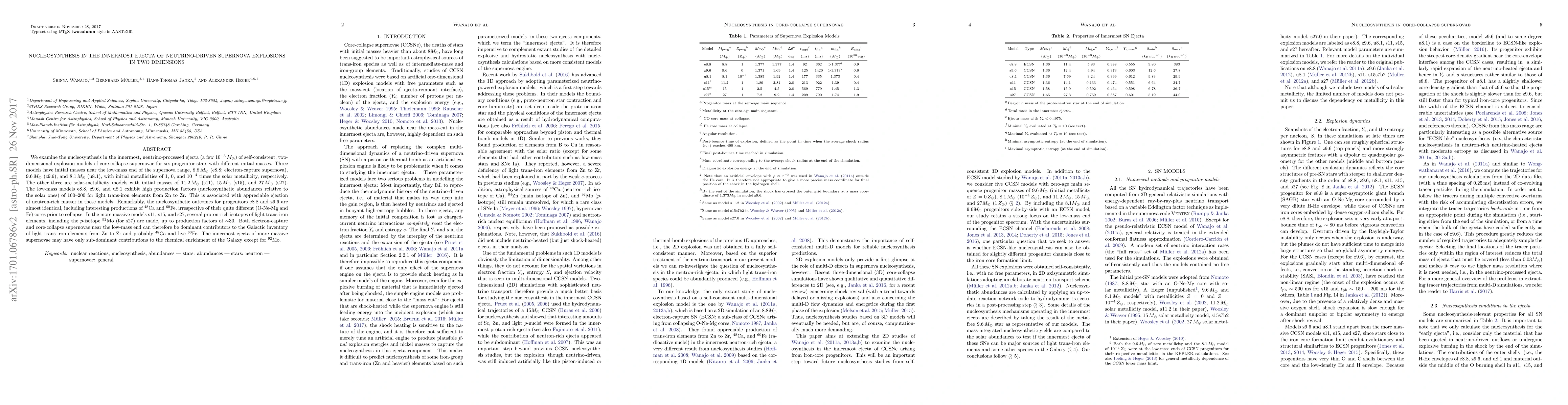 This paper investigates nucleosynthesis in the innermost ejecta of neutrino-driven supernova explosions in two dimensions for six progenitor stars of varying masses. It finds that low-mass progenitors produce high abundances of light trans-iron elements, while more massive ones produce proton-rich isotopes, highlighting the significant role of both electron-capture and core-collapse supernovae in enriching the Galaxy with these elements.