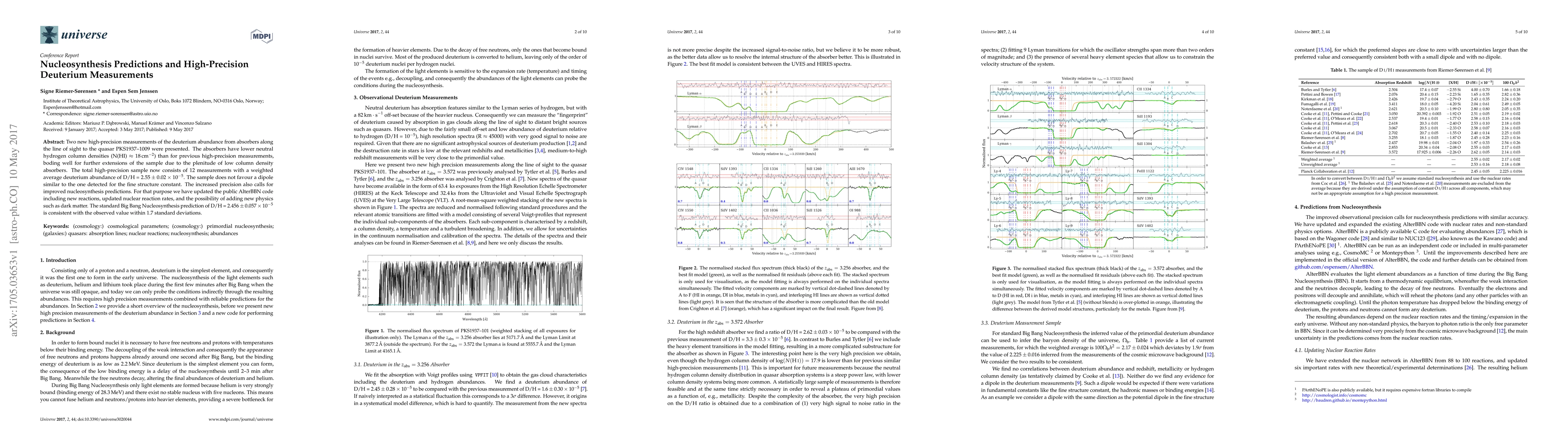 Two new high-precision measurements of the deuterium abundance from absorbers along the line of sight to the quasar PKS1937--1009 were presented. The absorbers have lower neutral hydrogen column densities (N(HI) $\approx$ 18\,cm$^{-2}$) than for previous high-precision measurements, boding well for further extensions of the sample due to the plenitude of low column density absorbers. The total high-precision sample now consists of 12 measurements with a weighted average deuterium abundance of D/H = $2.55\pm0.02\times10^{-5}$. The sample does not favour a dipole similar to the one detected for the fine structure constant. The increased precision also calls for improved nucleosynthesis predictions. For that purpose we have updated the public AlterBBN code including new reactions, updated nuclear reaction rates, and the possibility of adding new physics such as dark matter. The standard Big Bang Nucleosynthesis prediction of D/H = $2.456\pm0.057\times10^{-5}$ is consistent with the observed value within 1.7 standard deviations.