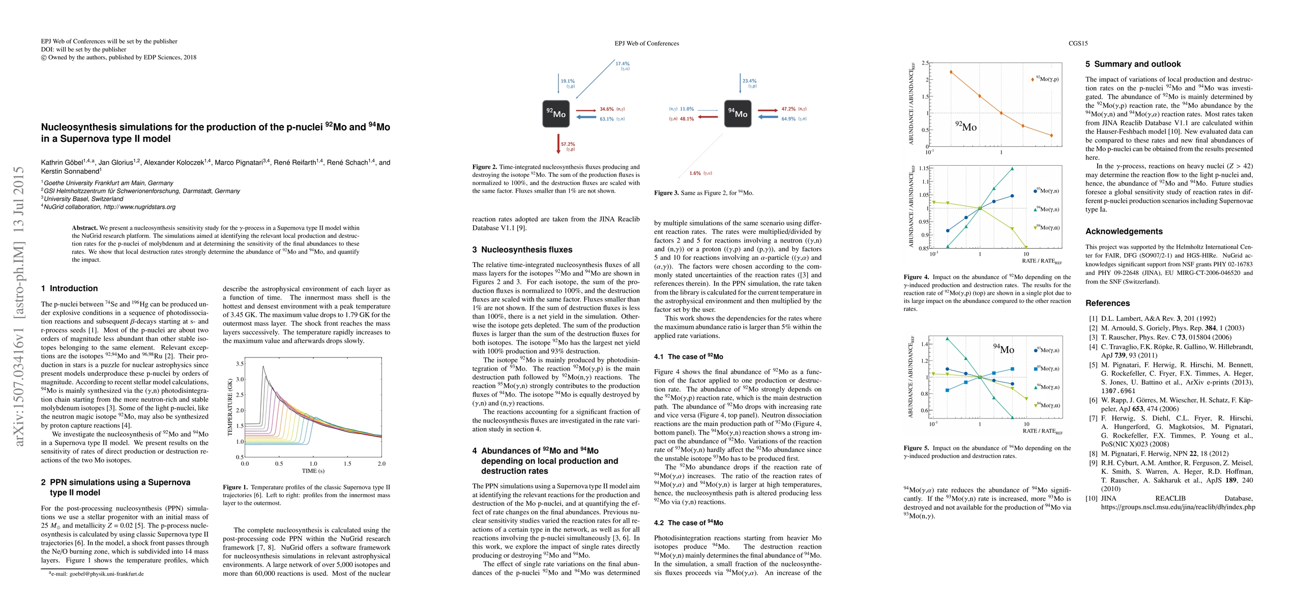 The study simulates p-nuclei production, specifically $^{92}$Mo and $^{94}$Mo, in a Supernova type II event using the NuGrid platform. It highlights local destruction rates significantly impacting these Mo isotopes' abundances.