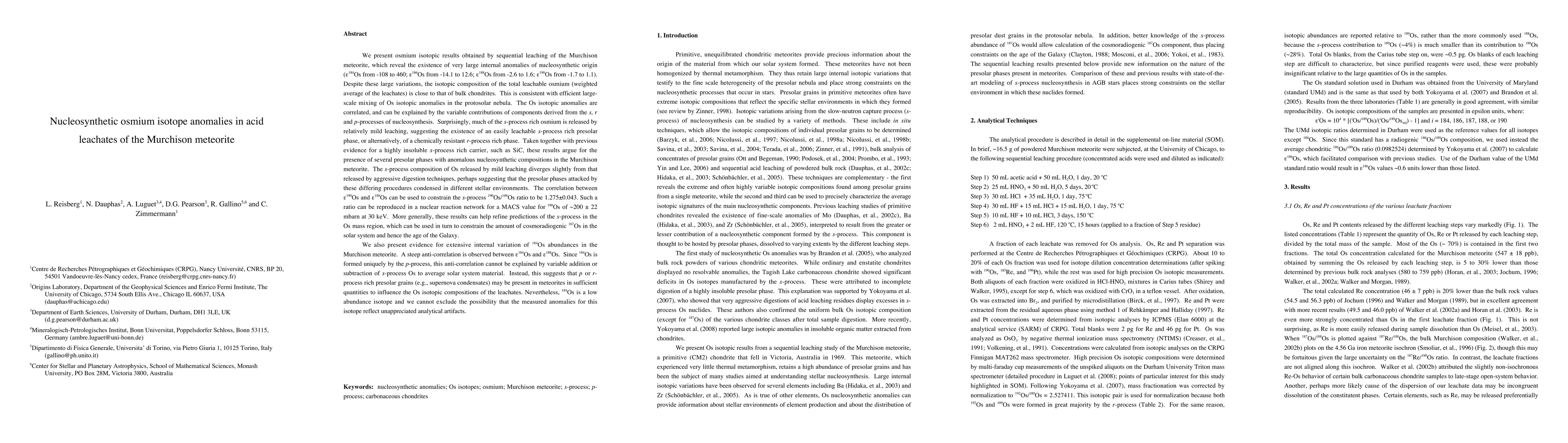 This study reveals significant nucleosynthetic osmium isotope anomalies in the Murchison meteorite, indicating contributions from s, r, and p-processes. The findings suggest the presence of easily leachable s-process rich presolar phases or chemically resistant r-process rich phases, with the s-process composition varying between leaching methods, hinting at different stellar environments of origin.