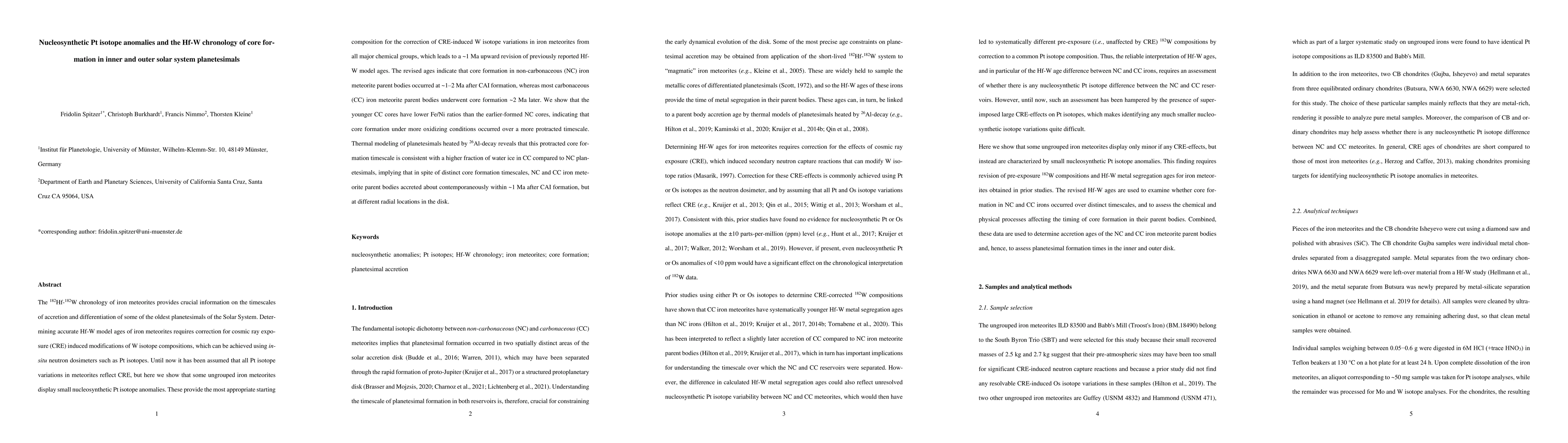 This paper reveals nucleosynthetic Pt isotope anomalies in some iron meteorites, which refine the correction of cosmic ray exposure effects on W isotopes, leading to a ~1 Ma revision in Hf-W model ages. This indicates core formation in non-carbonaceous bodies occurred ~1-2 Ma post CAI formation, while carbonaceous bodies formed cores ~2 Ma later, suggesting different core formation timescales and conditions.
