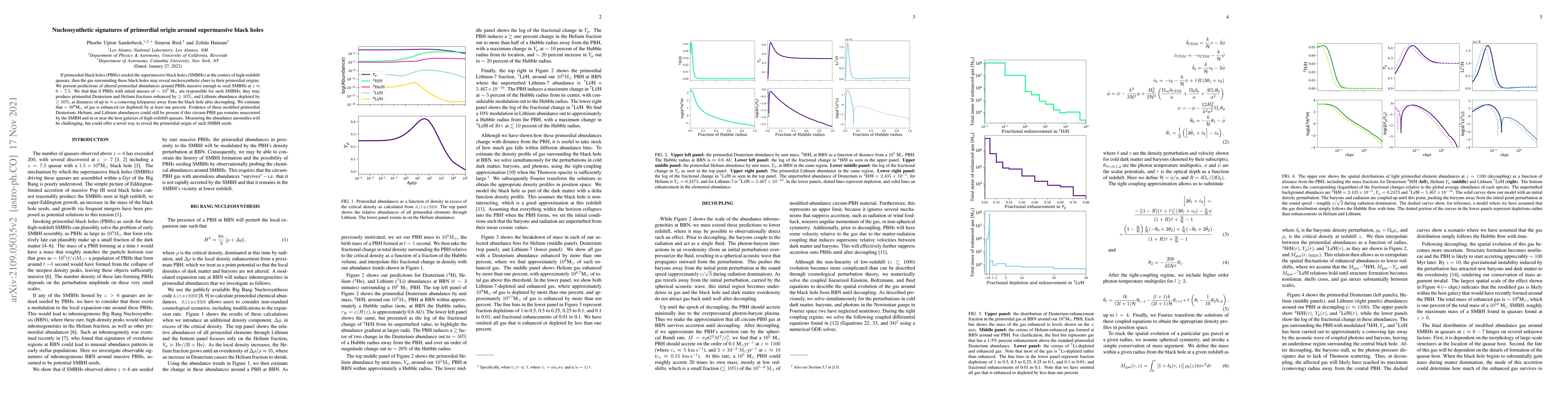 This paper explores nucleosynthetic signatures around supermassive black holes potentially seeded by primordial black holes, predicting enhanced nucleosynthetic abundances of Deuterium and Helium and depleted Lithium in surrounding gas. Such anomalies could provide evidence of primordial origins if the gas remains unaccreted, offering a novel method to investigate the formation of supermassive black holes.