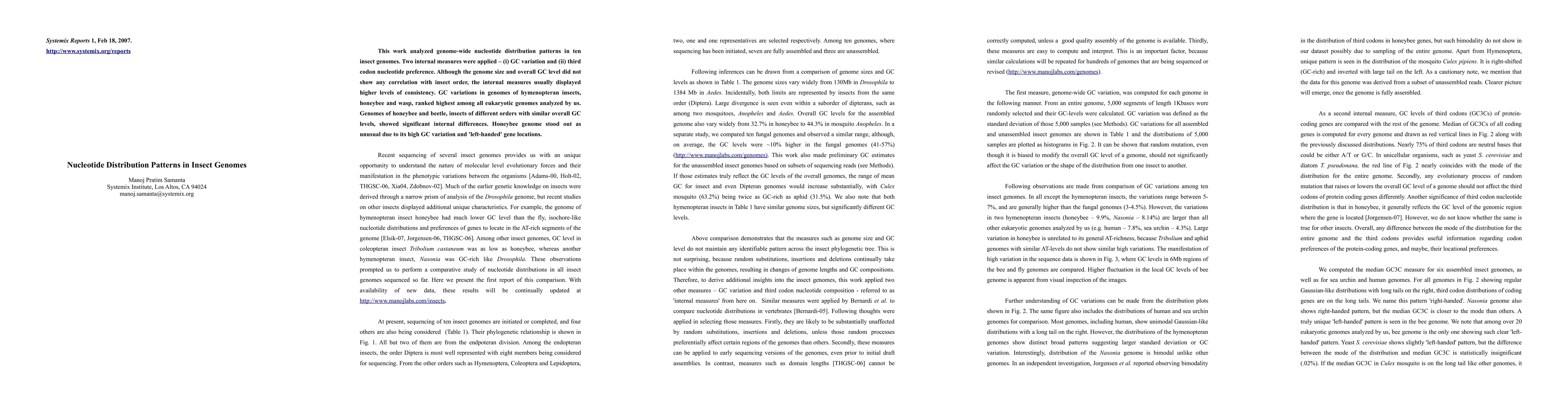 This study investigates genome-wide nucleotide distribution patterns in ten insect genomes, revealing that while genome size and GC levels do not correlate with insect order, GC variation and third codon nucleotide preference show higher consistency. Notably, hymenopteran insects like honeybees and wasps exhibit the highest GC variations, while honeybees also stand out due to high GC variation and unique 'left-handed' gene locations.