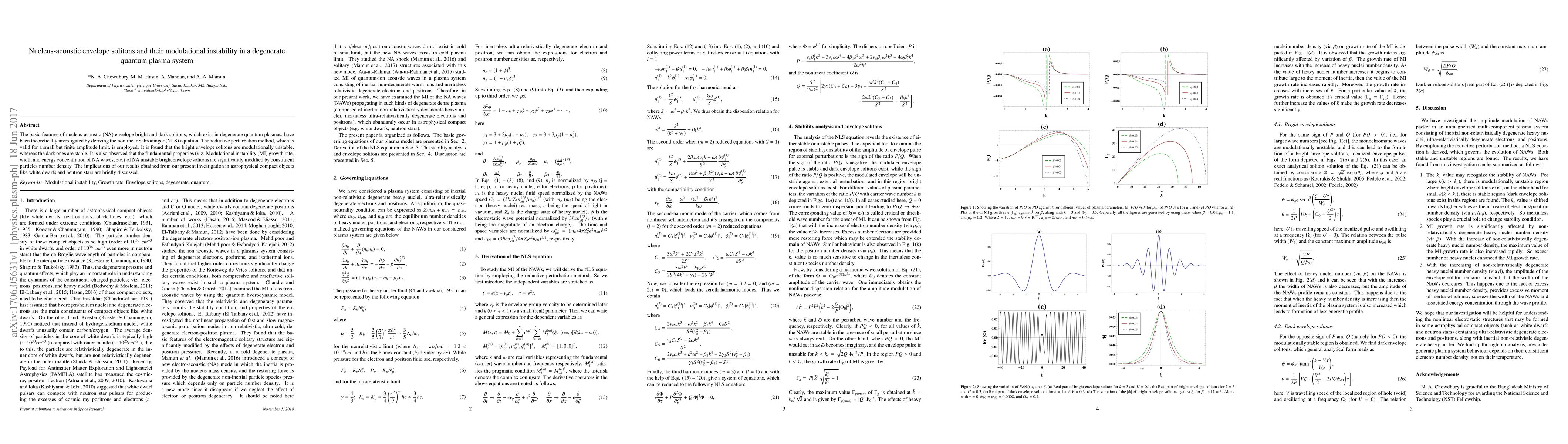 This paper investigates nucleus-acoustic solitons in degenerate quantum plasmas using the nonlinear Schrödinger equation, revealing that bright solitons are modulationally unstable while dark solitons are stable. The study highlights the significant impact of particle number density on the properties of unstable bright solitons and discusses implications for astrophysical compact objects.