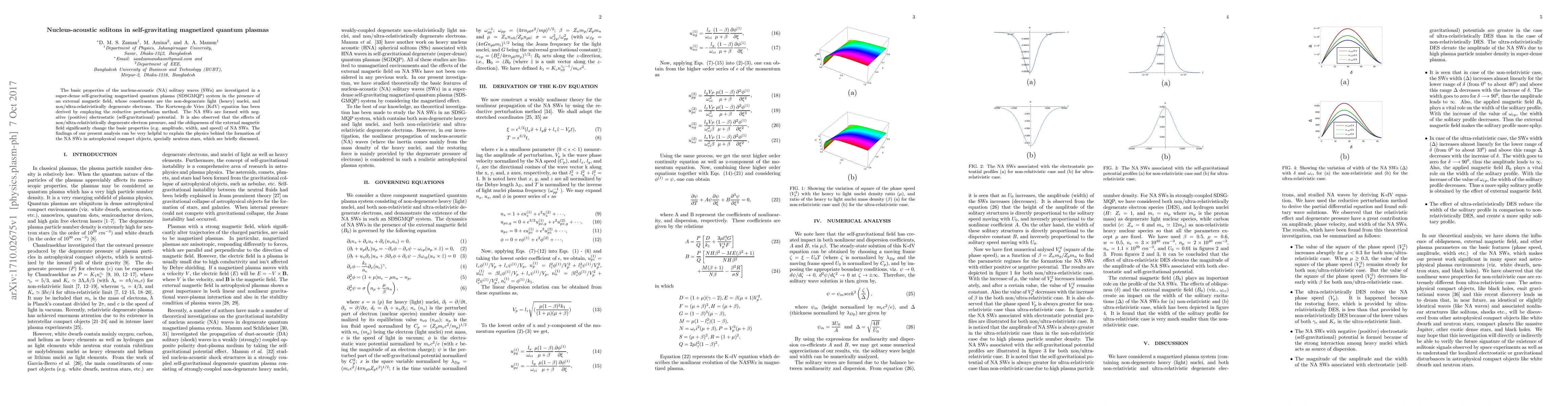 This paper investigates nucleus-acoustic solitary waves in self-gravitating magnetized quantum plasmas, deriving the KdV equation and analyzing how non-relativistic electron pressure and magnetic field obliqueness affect wave properties. The findings provide insights into the formation of such waves in astrophysical compact objects like neutron stars.