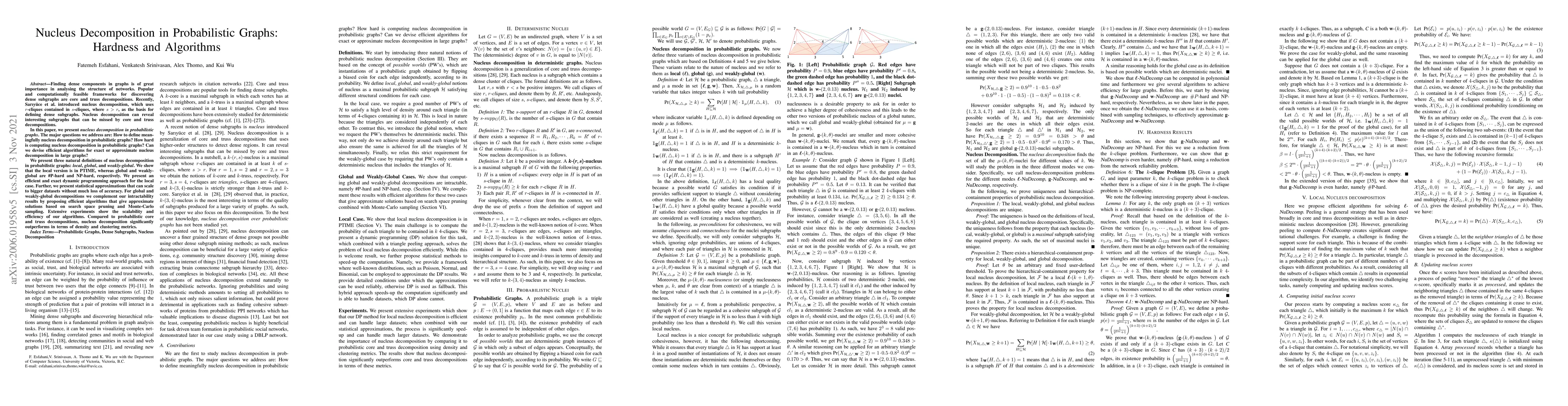 This paper explores nucleus decomposition in probabilistic graphs, focusing on the k-(3,4)-nucleus problem. It presents three definitions of nucleus decomposition and shows computational complexity, providing exact and approximate algorithms for large graphs, demonstrating superior performance over probabilistic core and truss decompositions.