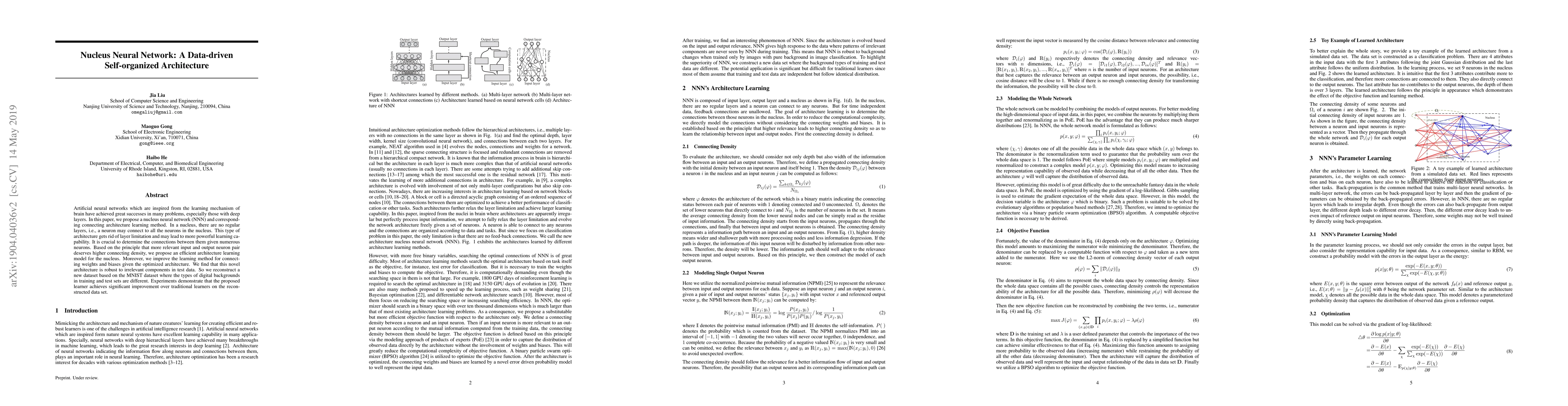 Artificial neural networks which are inspired from the learning mechanism of brain have achieved great successes in many problems, especially those with deep layers. In this paper, we propose a nucleus neural network (NNN) and corresponding connecting architecture learning method. In a nucleus, there are no regular layers, i.e., a neuron may connect to all the neurons in the nucleus. This type of architecture gets rid of layer limitation and may lead to more powerful learning capability. It is crucial to determine the connections between them given numerous neurons. Based on the principle that more relevant input and output neuron pair deserves higher connecting density, we propose an efficient architecture learning model for the nucleus. Moreover, we improve the learning method for connecting weights and biases given the optimized architecture. We find that this novel architecture is robust to irrelevant components in test data. So we reconstruct a new dataset based on the MNIST dataset where the types of digital backgrounds in training and test sets are different. Experiments demonstrate that the proposed learner achieves significant improvement over traditional learners on the reconstructed data set.