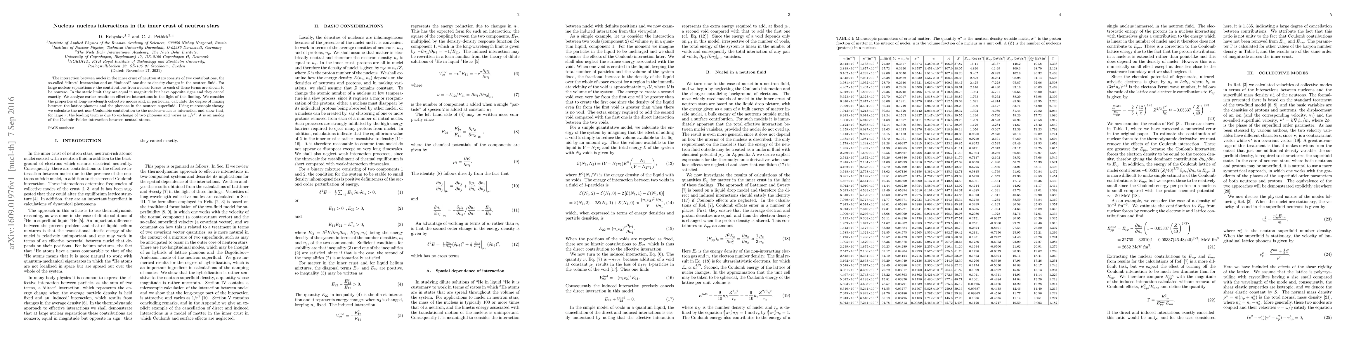 The interaction between nuclei in the inner crust of neutron stars consists of two contributions, the so-called "direct" interaction and an "induced" one due to density changes in the neutron fluid. For large nuclear separations $r$ the contributions from nuclear forces to each of these terms are shown to be nonzero. In the static limit they are equal in magnitude but have opposite signs and they cancel exactly. We analyze earlier results on effective interactions in the light of this finding. We consider the properties of long-wavelength collective modes and, in particular, calculate the degree of mixing between the lattice phonons and the phonons in the neutron superfluid. Using microscopic theory, we calculate the net non-Coulombic contribution to the nucleus--nucleus interaction and show that, for large $r$, the leading term is due to exchange of two phonons and varies as $1/r^7$: it is an analog of the Casimir--Polder interaction between neutral atoms.