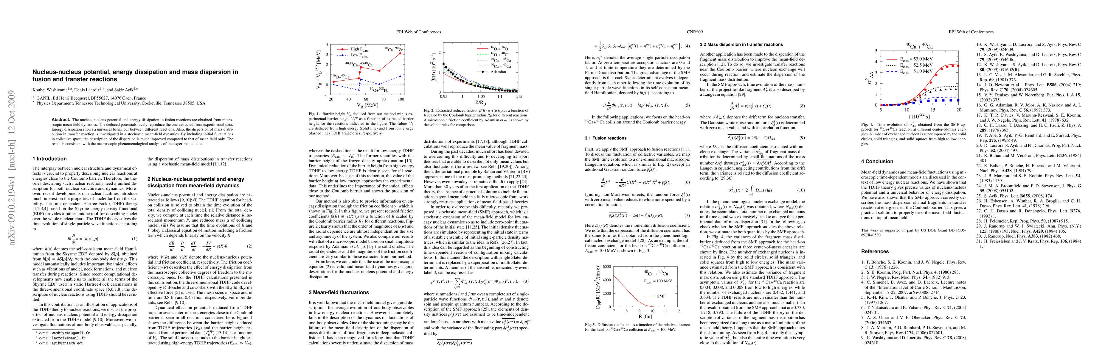 This paper investigates the nucleus-nucleus potential and energy dissipation in fusion reactions using microscopic mean-field dynamics, showing universal behavior across different reactions. It also examines mass dispersion in transfer reactions with stochastic mean-field dynamics, significantly improving the description by including initial fluctuations, consistent with macroscopic analysis of experimental data.