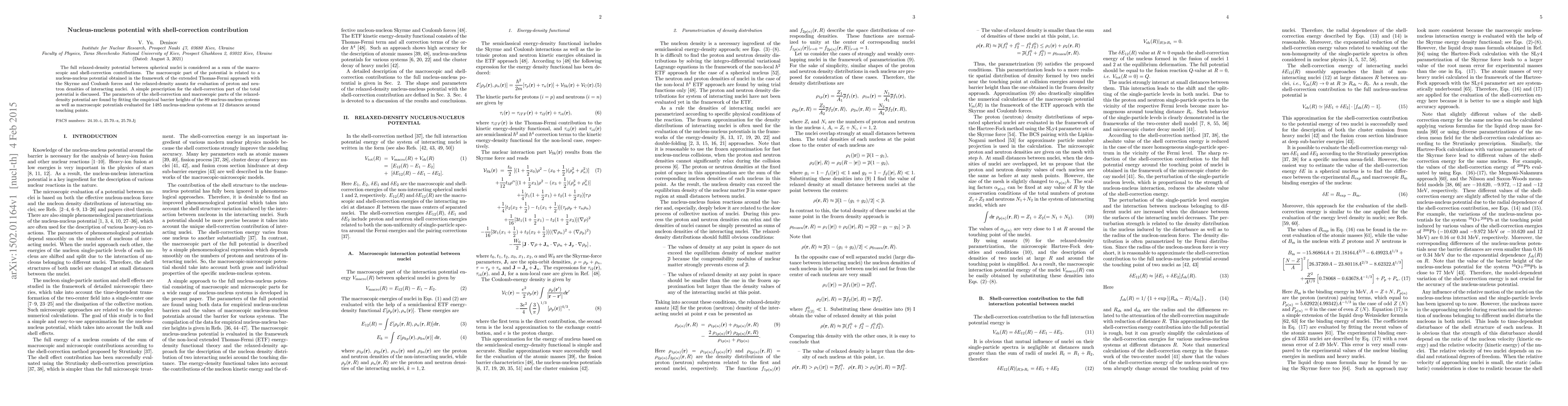 This paper investigates the full relaxed-density potential between spherical nuclei, decomposing it into macroscopic and shell-correction contributions. The macroscopic part is derived from the extended Thomas-Fermi approach, while the shell-correction part is evaluated using a simple prescription, with parameters determined by fitting empirical data from numerous nucleus-nucleus systems.