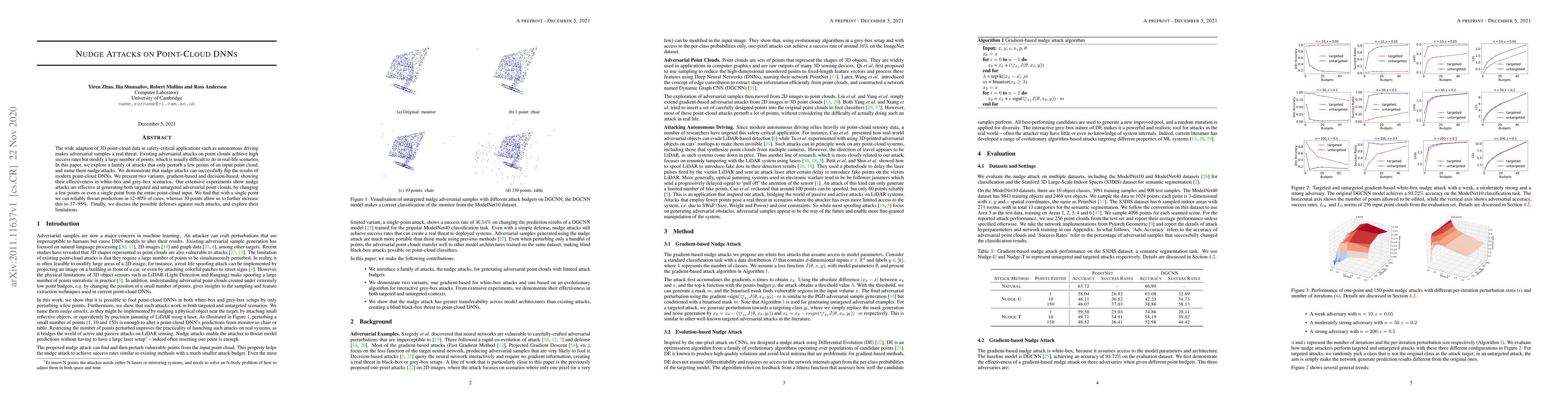 This paper investigates "nudge attacks" on point-cloud deep neural networks (DNNs), which perturb only a few points to successfully alter predictions. The study presents gradient-based and decision-based variants, demonstrating their effectiveness in various attack scenarios, and discusses potential defenses against these attacks.