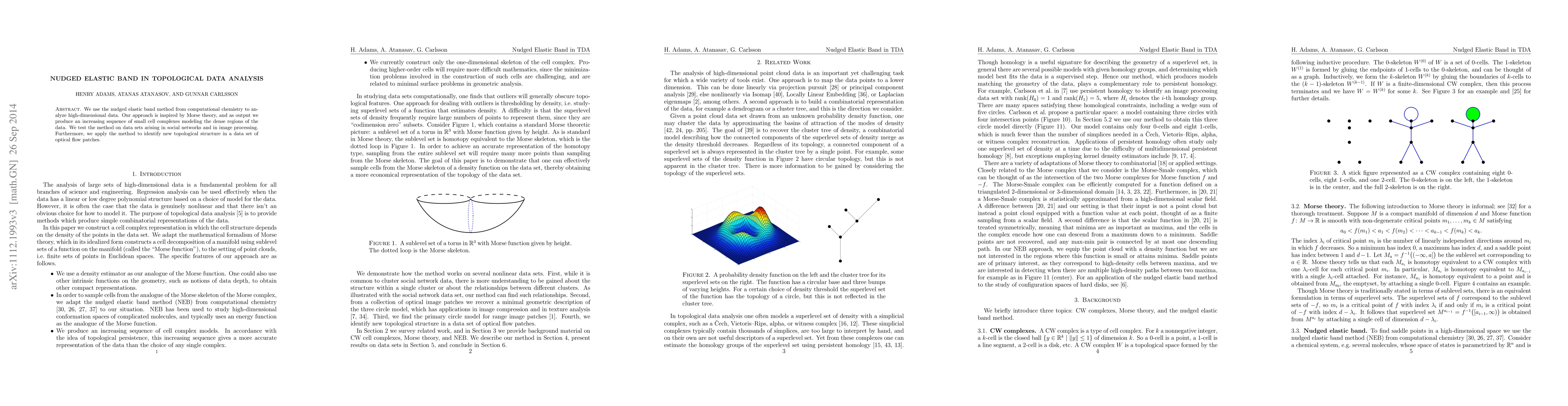 This paper employs the nudged elastic band method to analyze high-dimensional data, generating small cell complexes that model dense data regions inspired by Morse theory. The method is tested on social network and image processing datasets, and it identifies new topological structures in optical flow patches.