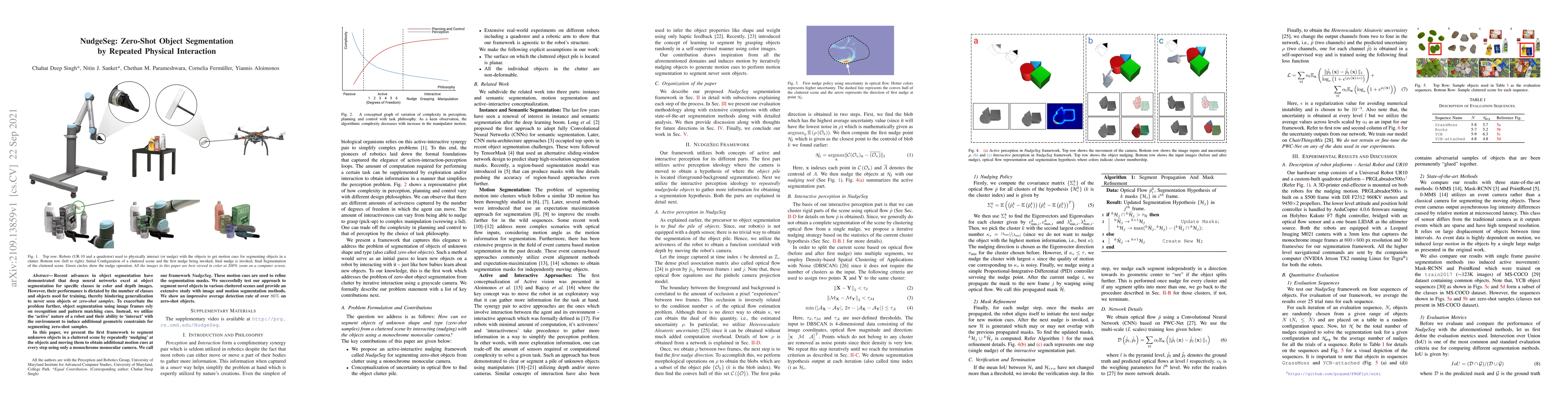 Recent advances in object segmentation have demonstrated that deep neural networks excel at object segmentation for specific classes in color and depth images. However, their performance is dictated by the number of classes and objects used for training, thereby hindering generalization to never seen objects or zero-shot samples. To exacerbate the problem further, object segmentation using image frames rely on recognition and pattern matching cues. Instead, we utilize the 'active' nature of a robot and their ability to 'interact' with the environment to induce additional geometric constraints for segmenting zero-shot samples. In this paper, we present the first framework to segment unknown objects in a cluttered scene by repeatedly 'nudging' at the objects and moving them to obtain additional motion cues at every step using only a monochrome monocular camera. We call our framework NudgeSeg. These motion cues are used to refine the segmentation masks. We successfully test our approach to segment novel objects in various cluttered scenes and provide an extensive study with image and motion segmentation methods. We show an impressive average detection rate of over 86% on zero-shot objects.