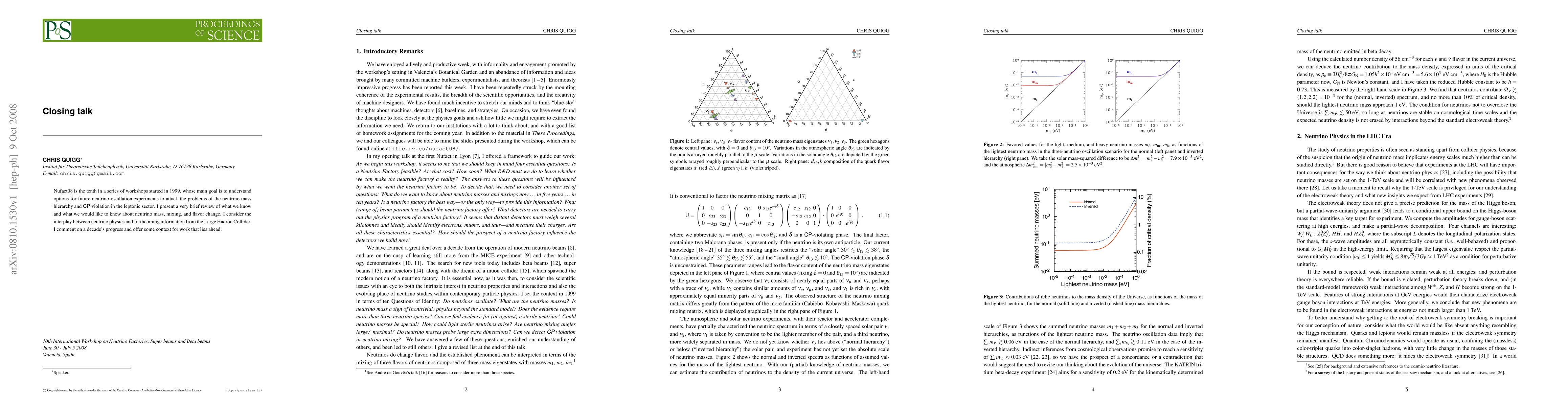 Nufact08 is the tenth in a series of workshops started in 1999, whose main goal is to understand options for future neutrino-oscillation experiments to attack the problems of the neutrino mass hierarchy and CP violation in the leptonic sector. I present a very brief review of what we know and what we would like to know about neutrino mass, mixing, and flavor change. I consider the interplay between neutrino physics and forthcoming information from the Large Hadron Collider. I comment on a decade's progress and offer some context for work that lies ahead.