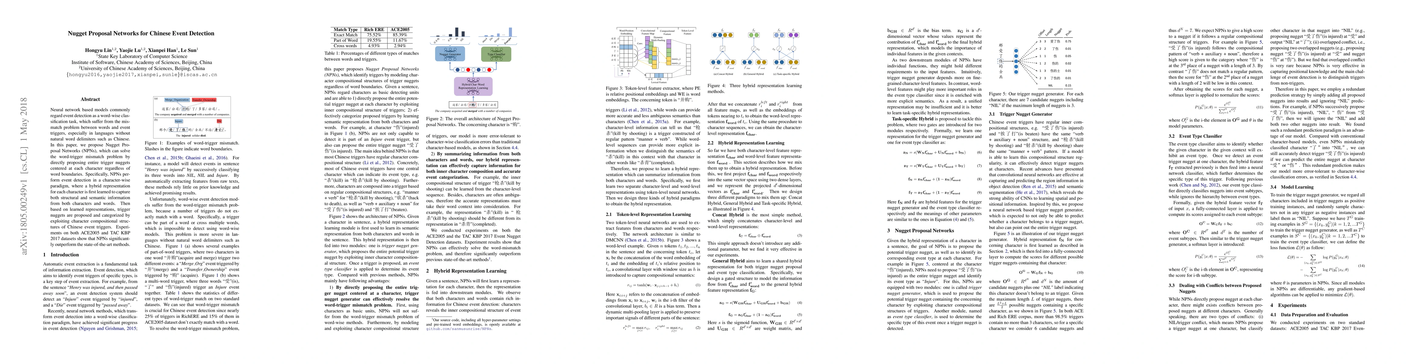 This paper proposes Nugget Proposal Networks (NPNs) to address the word-trigger mismatch problem in Chinese event detection by proposing entire trigger nuggets centered at each character. NPNs outperform state-of-the-art methods on ACE2005 and TAC KBP 2017 datasets.