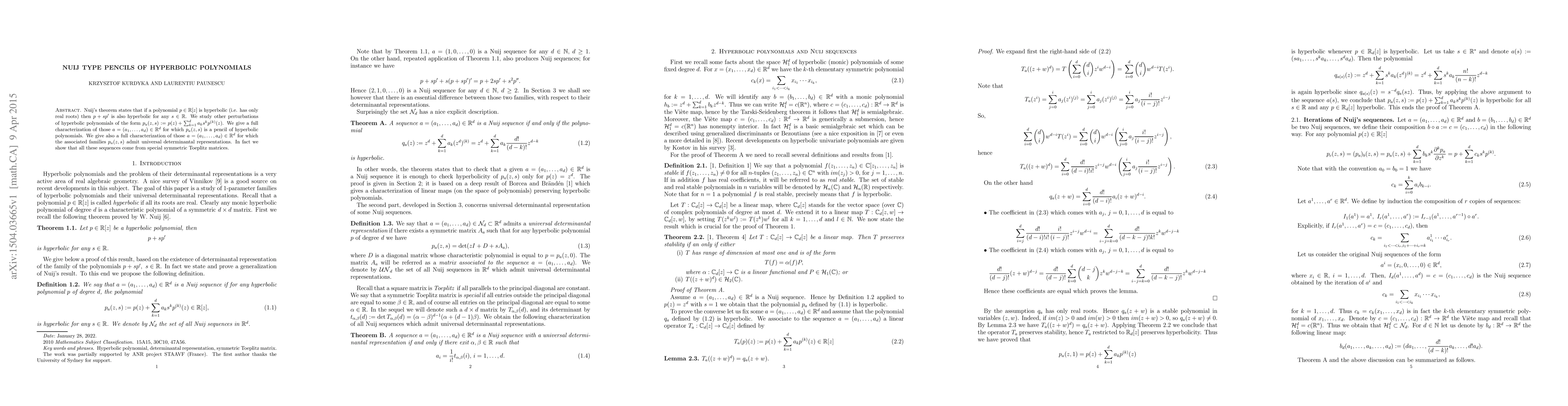 Nuij's theorem states that if a polynomial $p\in \mathbb{R}[z]$ is hyperbolic (i.e., has only real roots) then $p+sp'$ is also hyperbolic for any $s\in \mathbb{R}$. We study other perturbations of hyperbolic polynomials of the form $p_a(z,s): =p(z) +\sum_{k=1}^d a_ks^kp^{(k)}(z)$. We give a full characterization of those $a= (a_1, \dots, a_d) \in \mathbb{R}^d$ for which $p_a(z,s)$ is a pencil of hyperbolic polynomials. We give also a full characterization of those $a= (a_1, \dots, a_d) \in \mathbb{R}^d$ for which the associated families $p_a(z,s)$ admit universal determinantal representations. In fact we show that all these sequences come from special symmetric Toeplitz matrices.