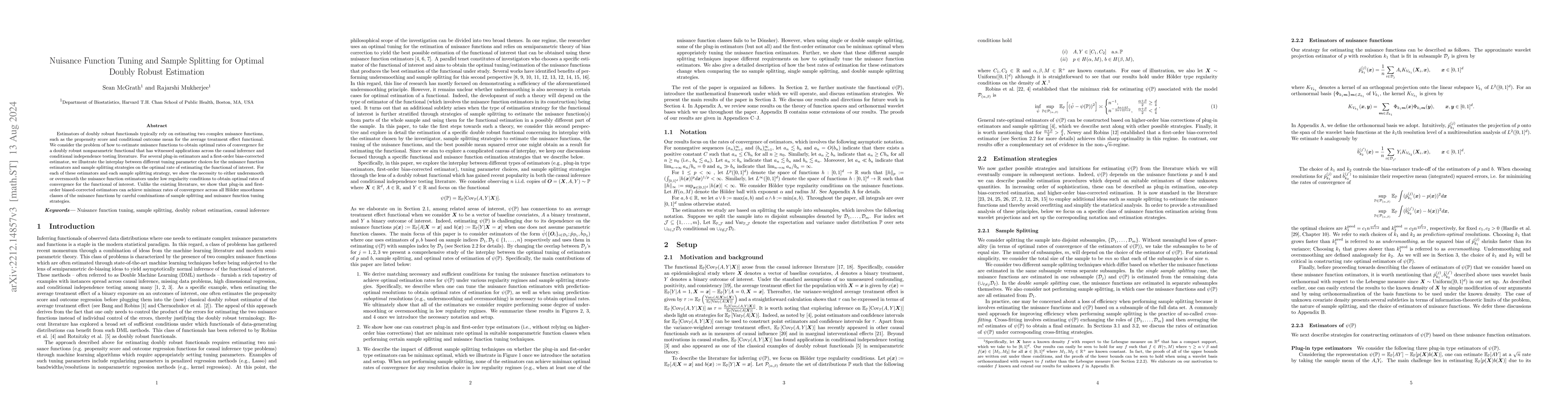 Estimators of doubly robust functionals typically rely on estimating two complex nuisance functions, such as the propensity score and conditional outcome mean for the average treatment effect functional. We consider the problem of how to estimate nuisance functions to obtain optimal rates of convergence for a doubly robust nonparametric functional that has witnessed applications across the causal inference and conditional independence testing literature. For several plug-in type estimators and a one-step type estimator, we illustrate the interplay between different tuning parameter choices for the nuisance function estimators and sample splitting strategies on the optimal rate of estimating the functional of interest. For each of these estimators and each sample splitting strategy, we show the necessity to undersmooth the nuisance function estimators under low regularity conditions to obtain optimal rates of convergence for the functional of interest. By performing suitable nuisance function tuning and sample splitting strategies, we show that some of these estimators can achieve minimax rates of convergence in all H\"older smoothness classes of the nuisance functions.