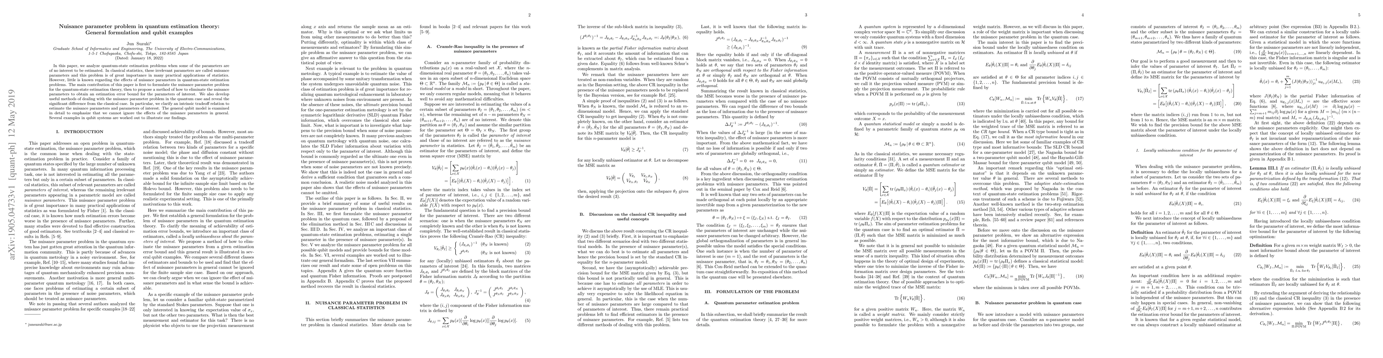 This paper formulates the nuisance parameter problem in quantum-state estimation theory and proposes methods to eliminate nuisance parameters, revealing significant differences from classical statistics. It highlights the intrinsic tradeoff in estimating nuisance parameters and parameters of interest, with detailed qubit examples illustrating these findings.