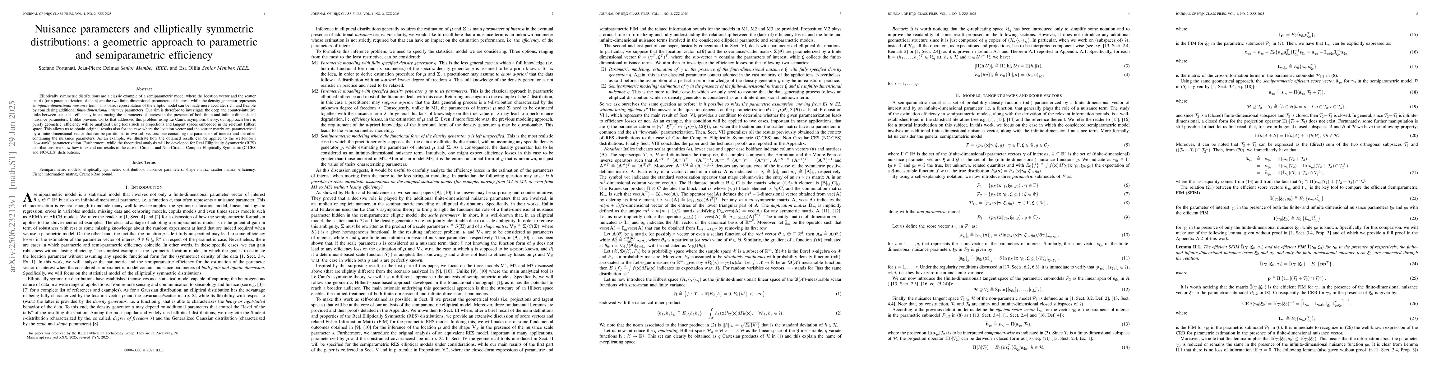 Elliptically symmetric distributions are a classic example of a semiparametric model where the location vector and the scatter matrix (or a parameterization of them) are the two finite-dimensional parameters of interest, while the density generator represents an \textit{infinite-dimensional nuisance} term. This basic representation of the elliptic model can be made more accurate, rich, and flexible by considering additional \textit{finite-dimensional nuisance} parameters. Our aim is therefore to investigate the deep and counter-intuitive links between statistical efficiency in estimating the parameters of interest in the presence of both finite and infinite-dimensional nuisance parameters. Unlike previous works that addressed this problem using Le Cam's asymptotic theory, our approach here is purely geometric: efficiency will be analyzed using tools such as projections and tangent spaces embedded in the relevant Hilbert space. This allows us to obtain original results also for the case where the location vector and the scatter matrix are parameterized by a finite-dimensional vector that can be partitioned in two sub-vectors: one containing the parameters of interest and the other containing the nuisance parameters. As an example, we illustrate how the obtained results can be applied to the well-known \virg{low-rank} parameterization. Furthermore, while the theoretical analysis will be developed for Real Elliptically Symmetric (RES) distributions, we show how to extend our results to the case of Circular and Non-Circular Complex Elliptically Symmetric (C-CES and NC-CES) distributions.