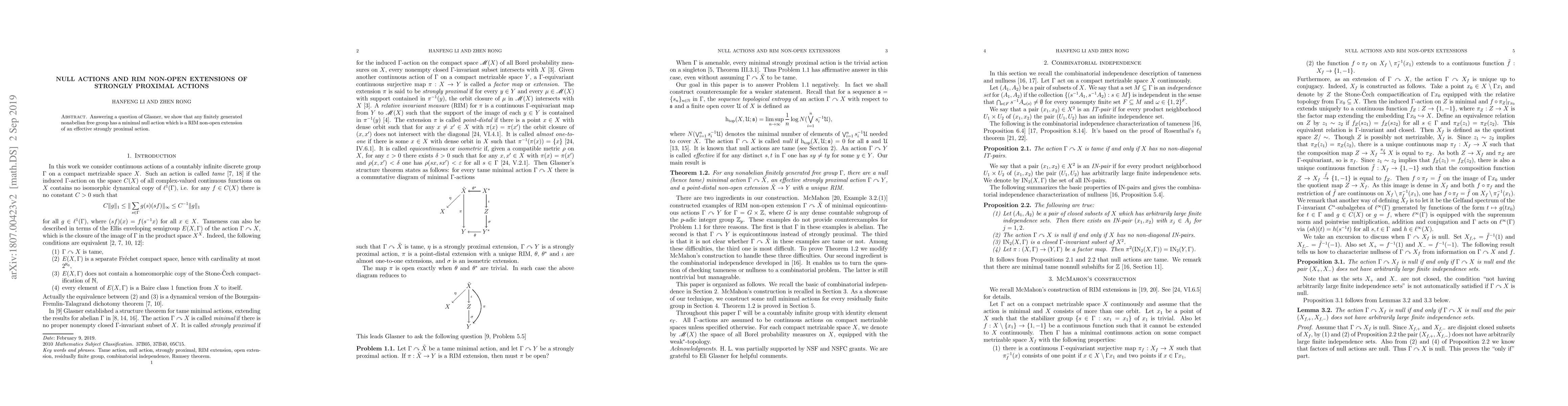 Answering a question of Glasner, we show that any finitely generated nonabelian free group has a minimal null action which is a RIM non-open extension of an effective strongly proximal action.