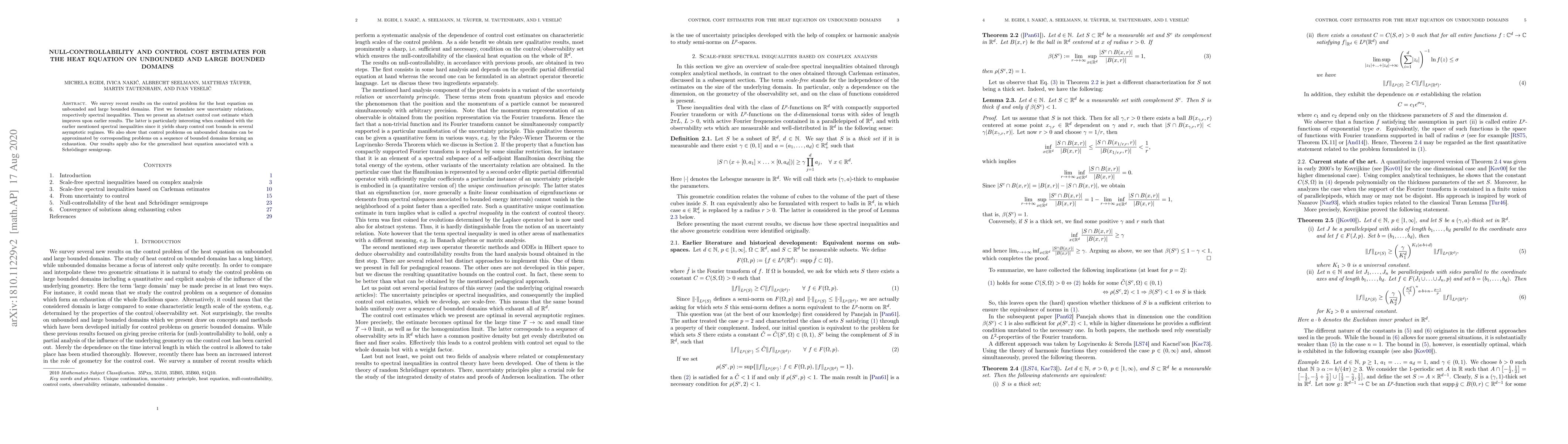 We survey recent results on the control problem for the heat equation on unbounded and large bounded domains. First we formulate new uncertainty relations, respectively spectral inequalities. Then we present an abstract control cost estimate which improves upon earlier results. It is particularly interesting when combined with the earlier mentioned spectral inequalities since it yields sharp control cost bounds in several asymptotic regimes. We also show that control problems on unbounded domains can be approximated by corresponding problems on a sequence of bounded domains forming an exhaustion. Our results apply also for the generalized heat equation associated with a Schr\"odinger semigroup.