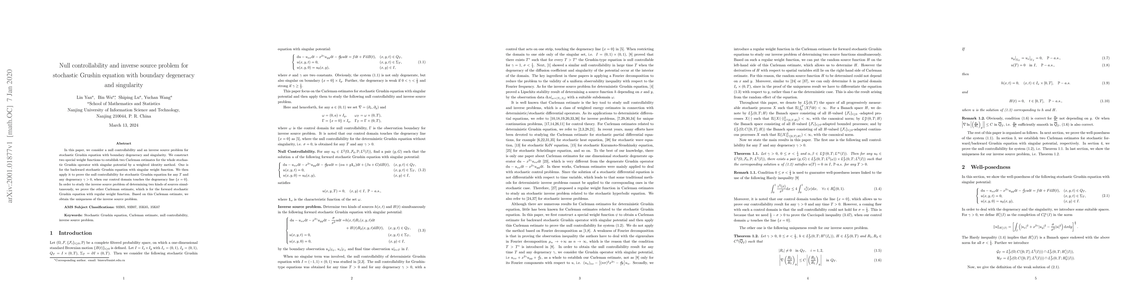 This paper investigates null controllability and an inverse source problem for a stochastic Grushin equation with boundary degeneracy and singularity. It constructs special weight functions to establish Carleman estimates, proving null controllability and the uniqueness of the inverse source problem for the stochastic Grushin equation.