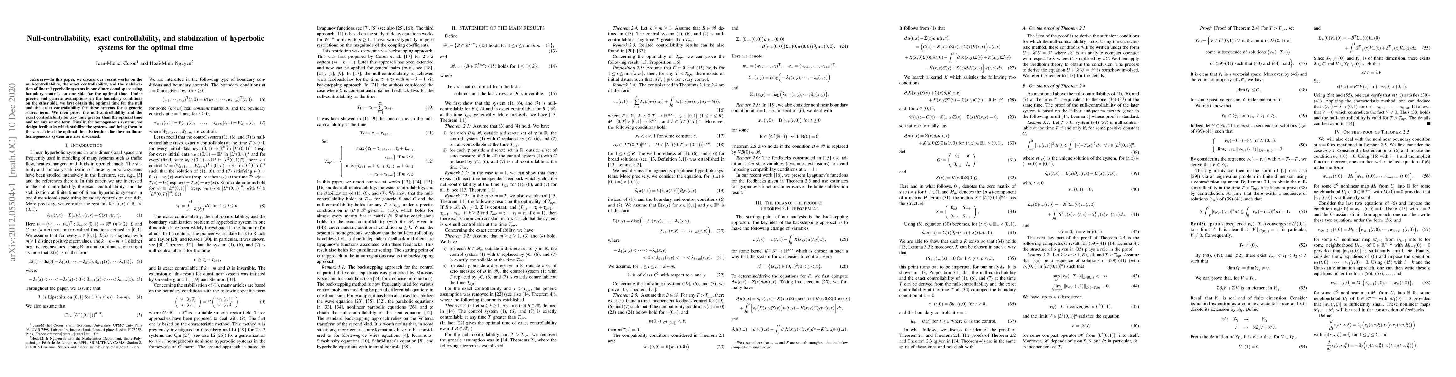 This paper investigates the null-controllability, exact controllability, and stabilization of linear hyperbolic systems in one dimension using boundary controls. It establishes optimal time bounds for controllability and designs stabilizing feedbacks for homogeneous systems.