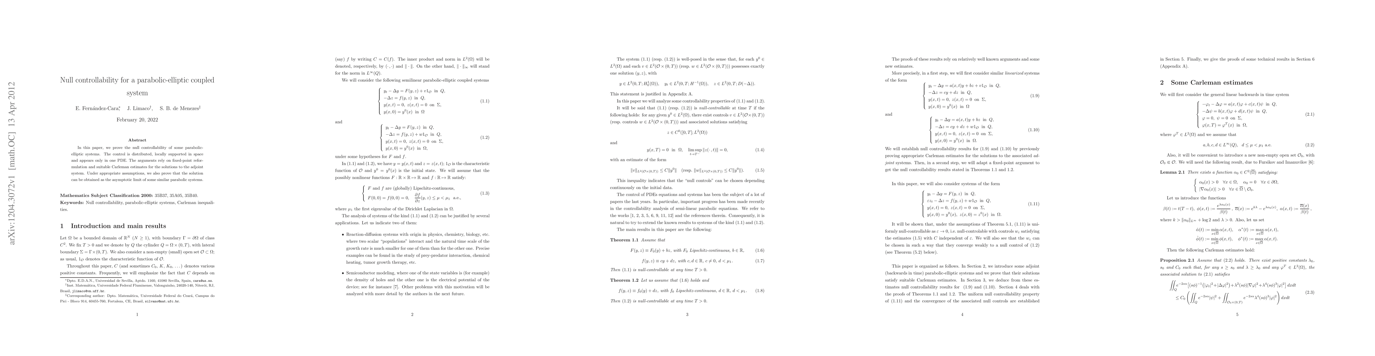 This paper proves the null controllability of a parabolic-elliptic coupled system with distributed control using fixed-point reformulation and Carleman estimates. The control is locally supported in space and affects only one PDE, and the solution can be asymptotically obtained from similar parabolic systems.