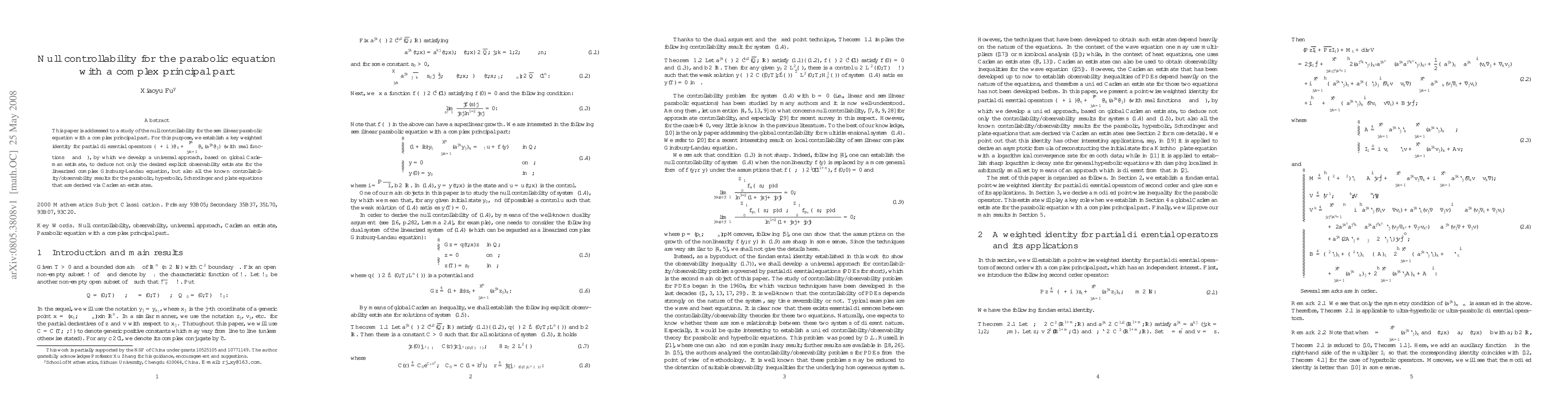 This paper is addressed to a study of the null controllability for the semilinear parabolic equation with a complex principal part. For this purpose, we establish a key weighted identity for partial differential operators $(\a+i\b)\pa_t+\sum\limits_{j,k=1}^n\pa_k(a^{jk}\pa_j)$ (with real functions $\a$ and $\b$), by which we develop a universal approach, based on global Carleman estimate, to deduce not only the desired explicit observability estimate for the linearized complex Ginzburg-Landau equation, but also all the known controllability/observability results for the parabolic, hyperbolic, Schr\"odinger and plate equations that are derived via Carleman estimates.