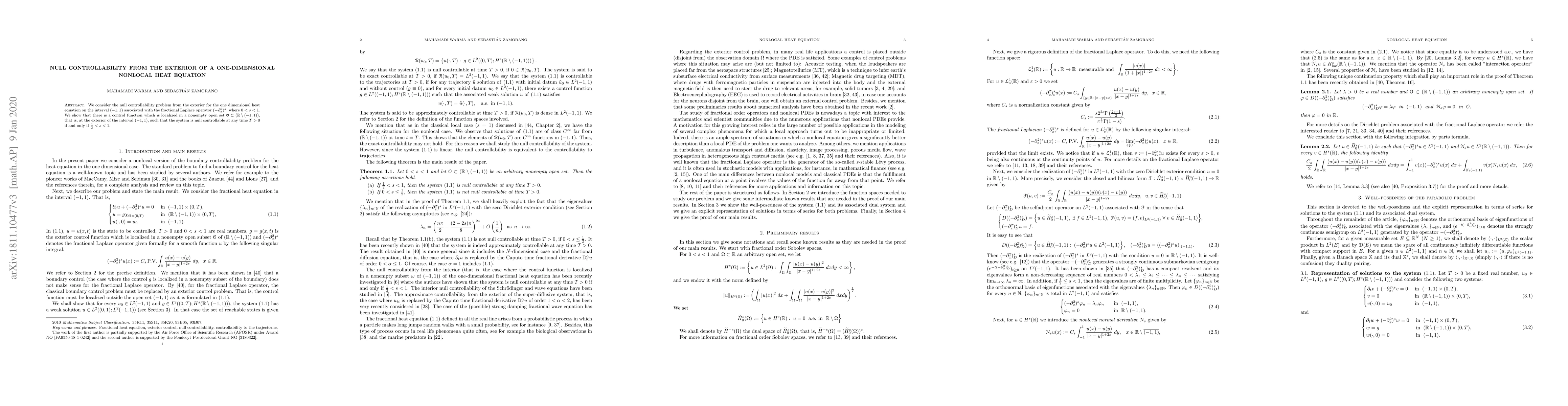Summary: This paper investigates the null controllability of a one-dimensional nonlocal heat equation with the fractional Laplace operator. It demonstrates that the system can be null controlled from the exterior if $0.5 < s < 1$, where $s$ is the nonlocality parameter.