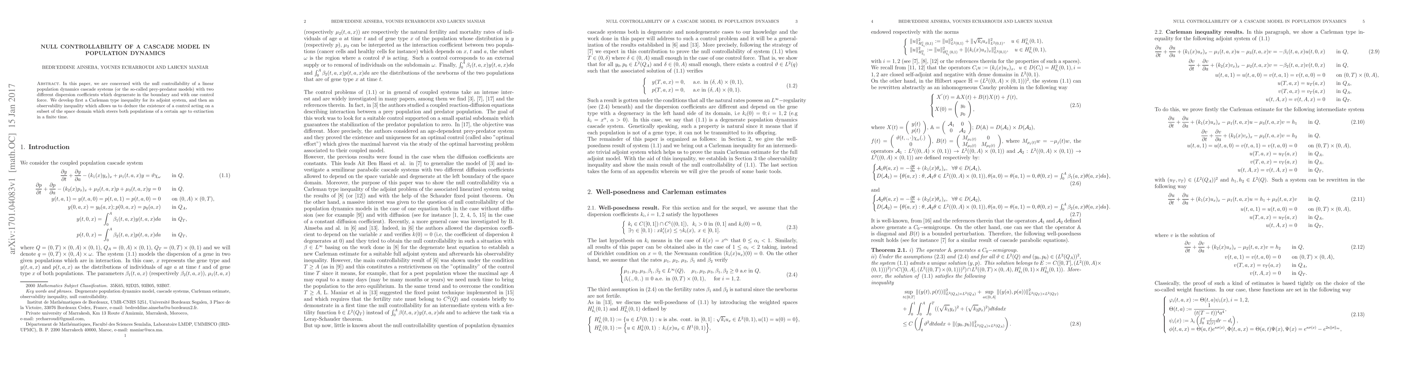 In this paper, we are concerned with the null controllability of a linear population dynamics cascade systems (or the so-called prey-predator models) with two different dispersion coefficients which degenerate in the boundary and with one control force. We develop first a Carleman type inequality for its adjoint system, and then an observability inequality which allows us to deduce the existence of a control acting on a subset of the space domain which steers both populations of a certain age to extinction in a finite time.