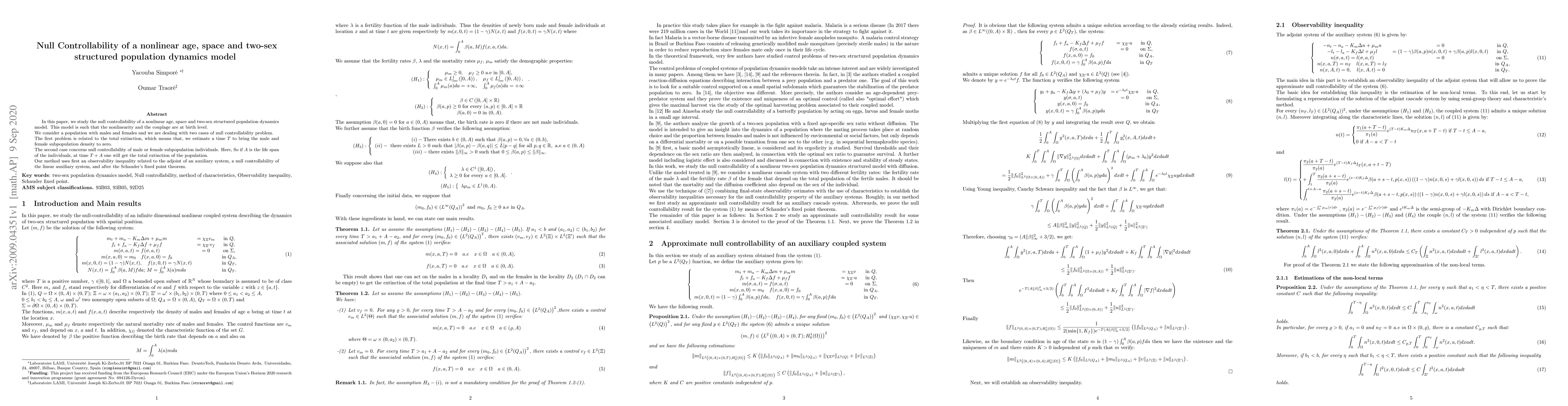 In this paper, we study the null controllability of a nonlinear age, space and two-sex structured population dynamics model. This model is such that the nonlinearity and the couplage are at birth level. We consider a population with males and females and we are dealing with two cases of null controllability problem. The first problem is related to the total extinction, which means that, we estimate a time $T$ to bring the male and female subpopulation density to zero. The second case concerns null controllability of male or female subpopulation individuals. Here, So if $A$ is the life span of the individuals, at time $T+A$ one will get the total extinction of the population. Our method uses first an observability inequality related to the adjoint of an auxiliary system, a null controllability of the linear auxiliary system, and after the Schauder's fixed point theorem.
