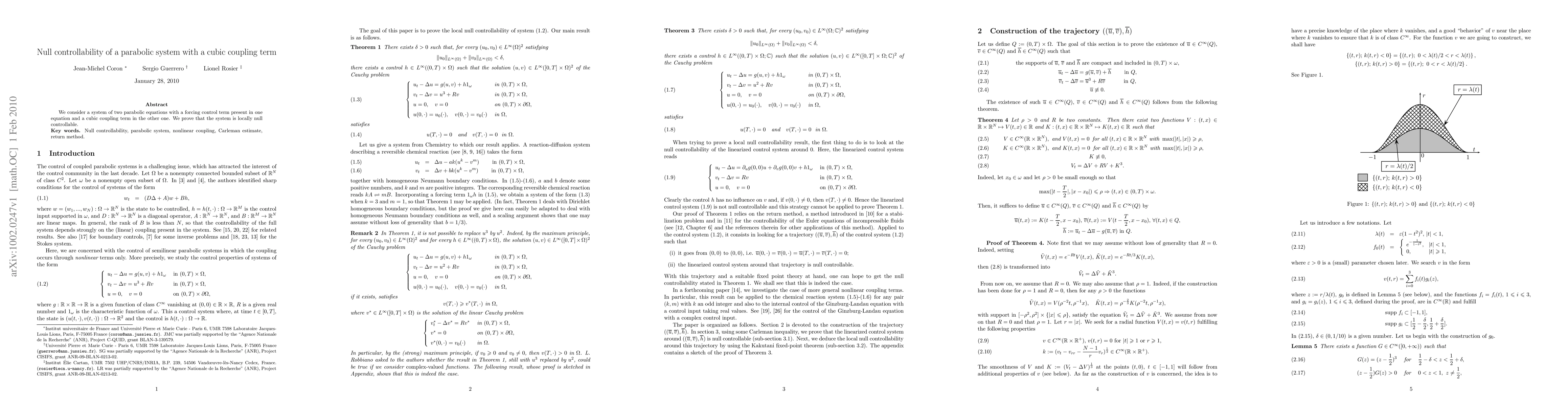 Summary: This paper investigates a system of two coupled parabolic equations with a cubic coupling term and a forcing term in one equation, proving local null controllability for the system.